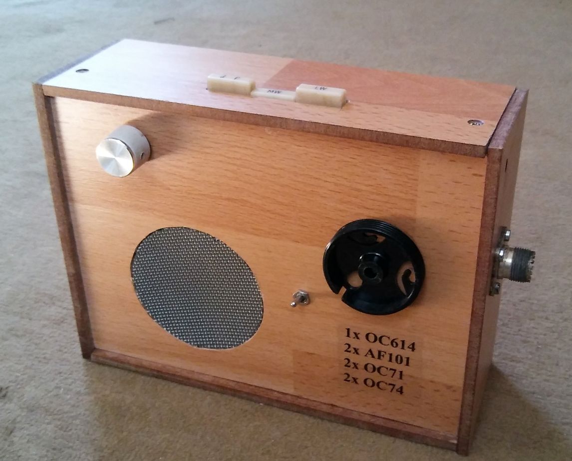 Der Abgleich der ZF-Kreise funktionierte wegen der Regelung nur mit einem Oszilloskop und nicht nach Gehör. Die resultierende Selektivität ist verglichen mit dem Telefunken Kamerad zwar besser, aber insgesamt bescheiden. Sender mit dem Abstand von 2 Kanälen = 18 kHz lassen sich aber trennen. Dafür brilliert das Gerät mit geringsten Audioverzerrungen und einem Spitzenfrequenzgang. Die Empfindlichkeit reicht zum leicht verrauschten Empfang des 200km entfernten und inzwischen in der Leistung deutlich reduzierten Senders Wawre auf 621 kHz mit Ferritantenne. Ich habe hier modernere Geräte, die diesen Sender mit Ferritantenne überhaupt nicht empfangen können. Die grösste Überraschung war der Anschluss an die Aussenantenne: Knackser und leichtes Antennenrauschen ist zu hören, aber keine Übersteuerung! Ich habe die Kopplung allerdings genauso wie im Kamerad über einen 10pF-Kondensator vorgenommen, der am heissen Ende des Abstimmkreises der Ferritantenne angeschlossen ist. Der TR1 von Telefunken benutzte damals eine Wicklung entlang des gesamten Ferrits parallel mit einem 160pF-Kondensator und verwendete die Zuleitung zum Steckernetzteil samt Lichtnetz als externe Antennenmöglichkeit. Derartige Methoden sind heute aus Störungsgründen ausgeschlossen.