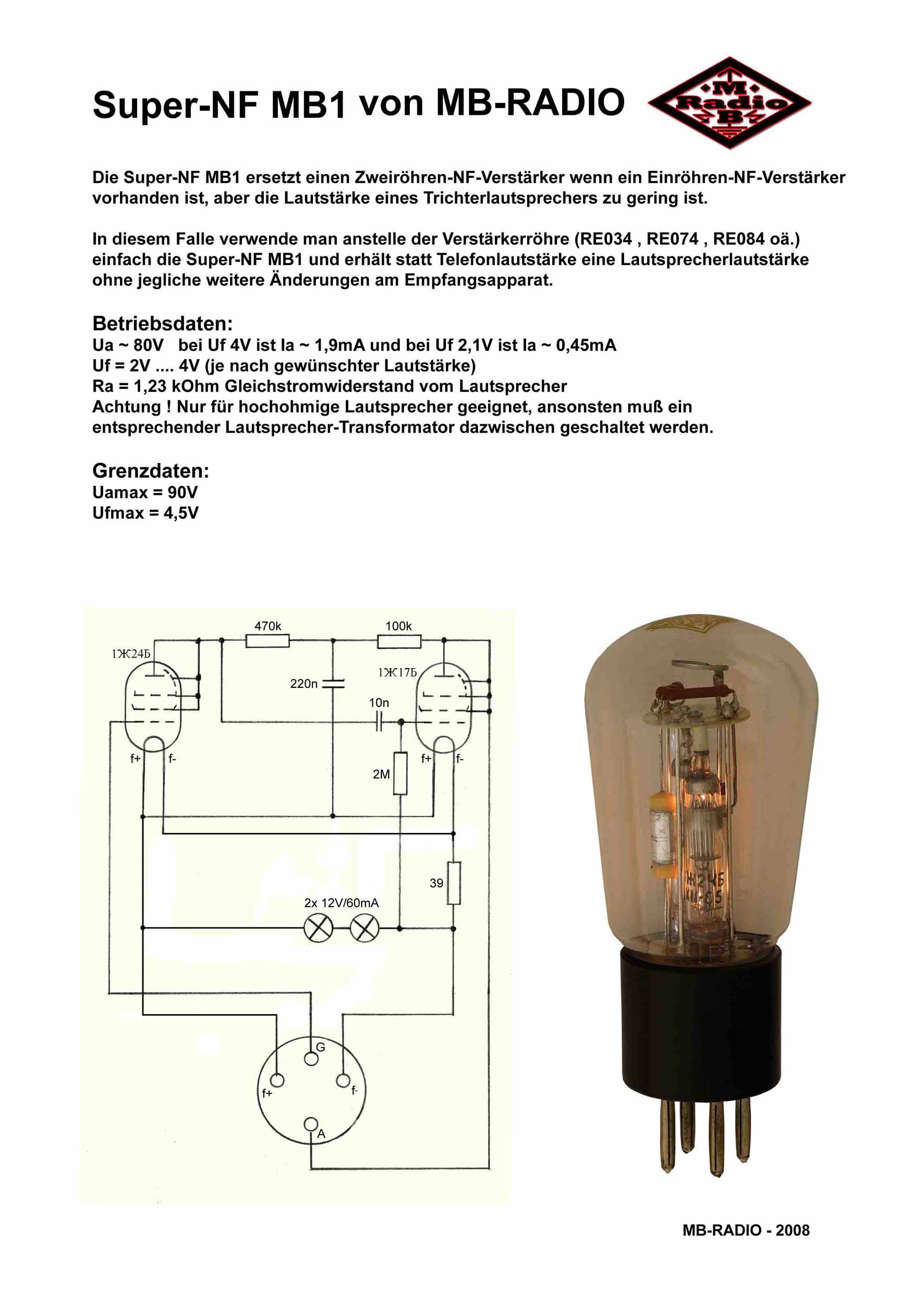 Mittlerweile habe ich aber einen Trichterlautsprecher und noch einen Verstärker wollte ich nicht bauen. Somit blieb nur die Möglichkeit eine hochverstärkende Röhre zu bauen. Es entstand meine "Super-NF MB1" - siehe Bild - aus den Teilen einer def. RE084 , zwei russischen Subminniröhren und paar Bauelemente. Jetzt kann ich Deutschlandradio Kultur heißt der Sender wohl auf LW 177kHz tagsüber mit dem Trichterlautsprecher in Zimmerlautstärke empfangen.