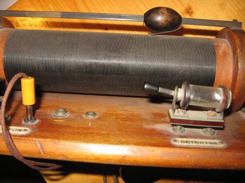 4) Einen Kristalldetektor (vorhanden). Der kleine Einsteller (besser dessen Drahtspitze) am Kristall-Detektor ist VORSICHTIG an verschiedene Stellen des Kristalls zu drücken bis ein Empfangsstelle auftaucht. Dabei den Schieber auf der Spule hin- und herschieben.