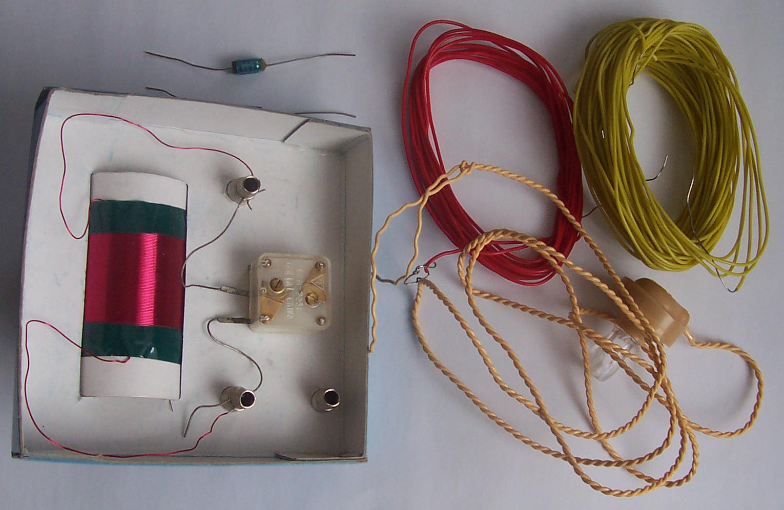 ja wohl wahr...aber für die Detektorkuriositätensammlung ist das doch ein kleines Highlight...denn es gibt kaum noch Spielzeughersteller die sich damit beschäftigen. Ein Schiebespulendetektor habe ich mal auf einer Holzspielzeugseite gesehen. Dieser Kosmoskasten "Detektorstart" ist ähnlich im Aufbau ...aber etwas robuster. Das Lustigste was es in dieser Art gibt, ist eine Detektorpostkarte (USA 50er) Alles drin, Diode, Pappdrehko und Spinnennetzspule. Das Ganze zum Aufklappen und hinstellen.