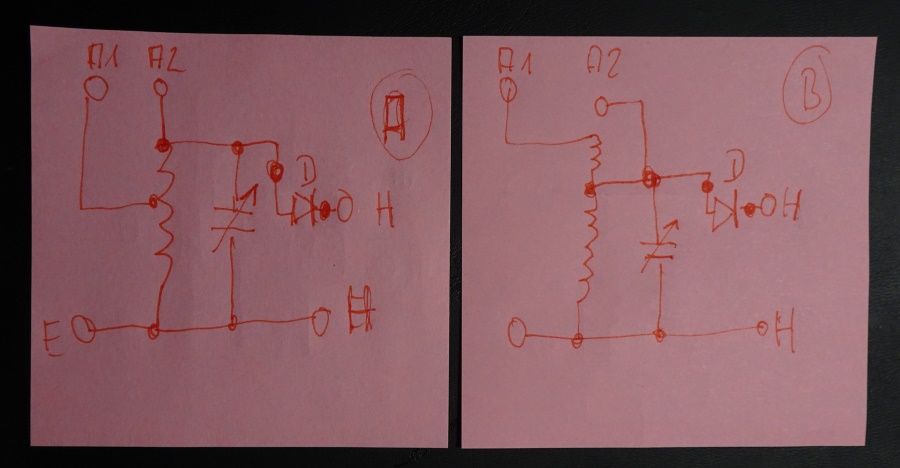 hier mal zwei Schaltbild-Varianten zusammen-gekrackelt, die ich dem Foto von Georg entnommen habe glaube (da die beiden inneren Spulenanzapf-Drähte an der Spule schwer zuordbar waren, jedenfalls ist das äußere Ende Erde: