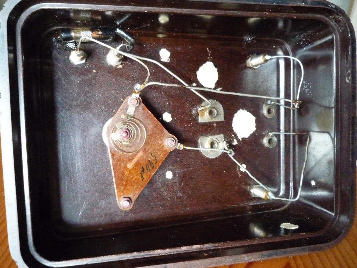 Laut "Radiomuseum" müsste eine Spule im Gehäuse sein, diese wurde offenbar herausgebrochen. Anschließend wurden die Löcher zugekittet und das Gerät von außen schwarzgrau lackiert. Letzteres ist so gut gemacht dass es auf den ersten Blick nicht auffällt (von der Farbe mal abgesehen).