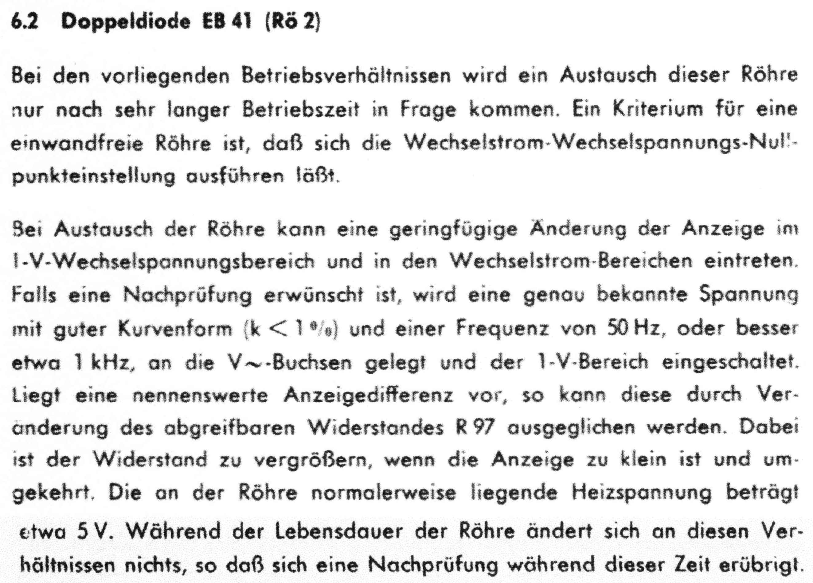 Danke auch Martin für die Erinnerung an die Tastkopf-Röhre. Ich habe noch 4 - 5 Stück EA50 bzw. VR92 rumliegen. Das müßte wohl reichen. Laut Anleitung soll die Röhre fast ewig halten. Sie wird ja nur mit ca. 5V geheizt. Beim evtl. Austausch muß laut Handbuch die Eingangskapazität auf 5,3 pF abgeglichen werden, damit die kapazitive Spannungsteilung klappt.