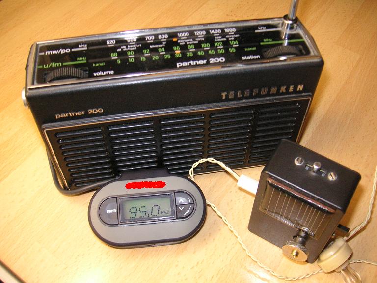 Die Frequenz kann in 100kHz Schritten, zwischen 88,1Mhz-107,9Mhz eingestellt werden. Das Ganze ist legal und ist aufgrund der schwachen Sendeleistung, postalisch zugelassen. Normalerweise werden diese Geräte im Auto verwendet. Man kann damit Audiosignale aus Mediaplayern, Laptops, Mobile usw. auf sein Autoradio in Stereo- Qualität übertragen. Für uns Bastler stellt es auch ein kleines Messgerät dar. Ich bin sehr zufrieden mit Rainers Tipp. Leider funktioniert es nicht für Flankendetektorgeräte, da hier nicht genug Feldstärke erzeugt wird. Auch der untersuchte Helix- Resonator gab kein Lebenszeichen...schade Für meinen UKW-MW Solarempfänger (...auch im Winter...) und für meinen Pendelempfänger ist der Transmitter ein echtes Messinstrument. Für neue Versuche werde ich das Gerät bestimmt benötigen. Leider habe ich keine tech. Daten zum Sender. Halt nur das heute übliche allg. ....bla, bla, in der Anleitung. Ich denke, dass die geringe Sendeleistung auch an der fehlenden externen Antenne liegt. Modifikationen sind natürlich verboten. 2x1,5V AAA bilden die Stromversorgung. Ein Adapter für den 12V Zigarettenanzünder liegt bei. Die Batterien sind als Beipack enthalten. 3 Jahre Garantie! Das Gerät schaltet sich automatisch Ein-Aus, wenn ein NF- Signal angelegt /ausgeschaltet wird. Beim C, MM, Sat.. sind diese Teile für kl. Geld zu finden.