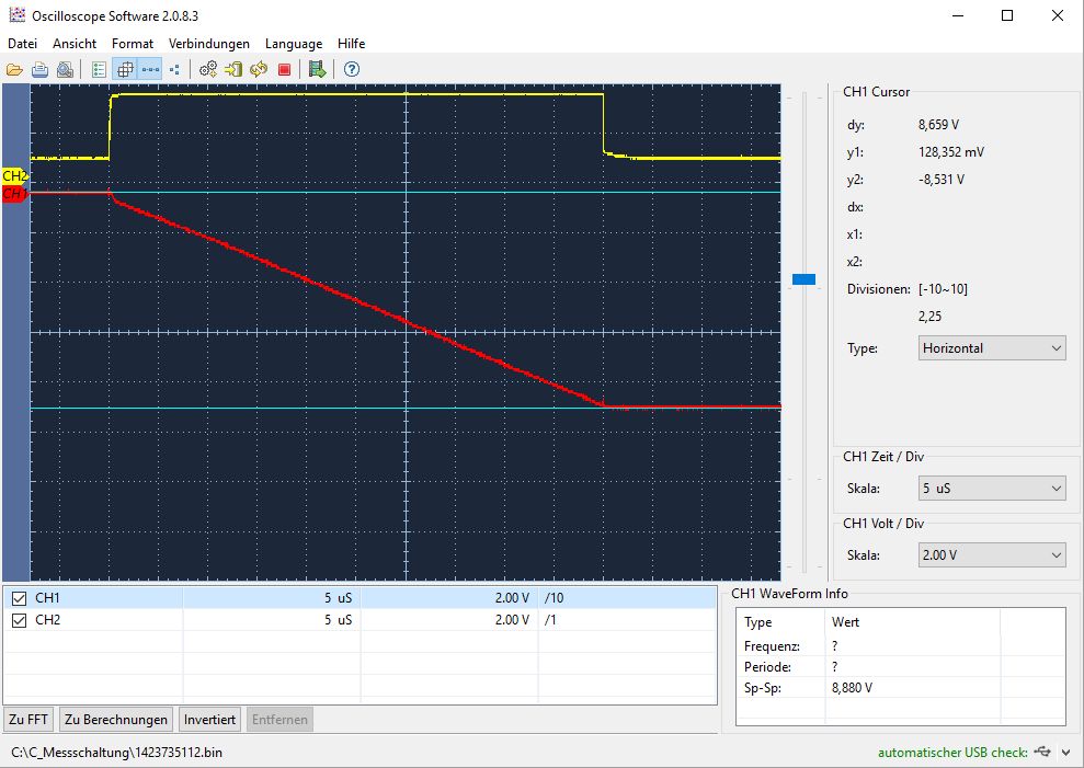 Der rote Kanal zeigt bei angeschlossener Kapazität (in diesem Fall 50pF) das Ende des fallenden Pegels bei 63 Prozent () an. In meinem Fall beträgt der Pegelunterschied ohne (sehr kleiner) Kapazität 13,68V, also muss ich mit externer Kapazität den Monoflop so einstellen, dass ich einen Pegelunterschied von ca 8,62V (63Prozent) bekomme (violette Cursor). Der gelbe Kanal zeigt mir jetzt die Kapazität in 1pF/µs an. Die Schaltung ist etwas umständlich, aber sie ist recht genau.