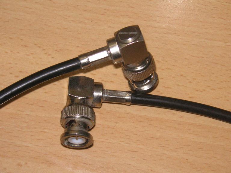 ich habe ein 1m langes Standartkabel verwendet, dass bei uns auf der Arbeit bis ca. 1MHz verwendet wird. Wir arbeiten in der Umrichtertechnik bis ca. 15kHz Taktfrequenz. Also weit weg von richtiger HF. Das Kabel ist geschirmt und entspricht den Normungen. Es hat zwei abgewinkelte BNC- Stecker aus Metall. Der Schirm ist gequetscht nicht gelötet.. Tja, also im NF- Bereich alles ok. Hier ein Foto vom Stecker.