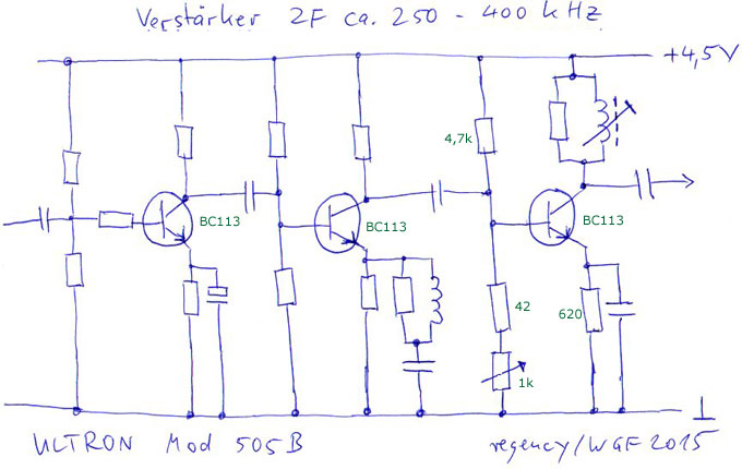 Den ZF Verstärkerteil zeigt folgendes Bild (ZF Frequenzangabe aus Kurzbeschreibung). Die zweite und dritte Stufe haben Frequenz filternde LC Kombinationen. Den Frequenzgang bestimmen ist nahe liegend. Vielleicht braucht es das aber gar nicht. Ich habe die Ausgangsspannung am Kollektor der dritten Stufe gemessen, am Eingang des Gerätes meinen Nordmende Prüfgenerator mit sehr geringem Pegel im VHF Bereich. Befund: Ein sauber aussehendes Sinussignal bis Uss ungefähr gleich doppelte Batteriespannung.