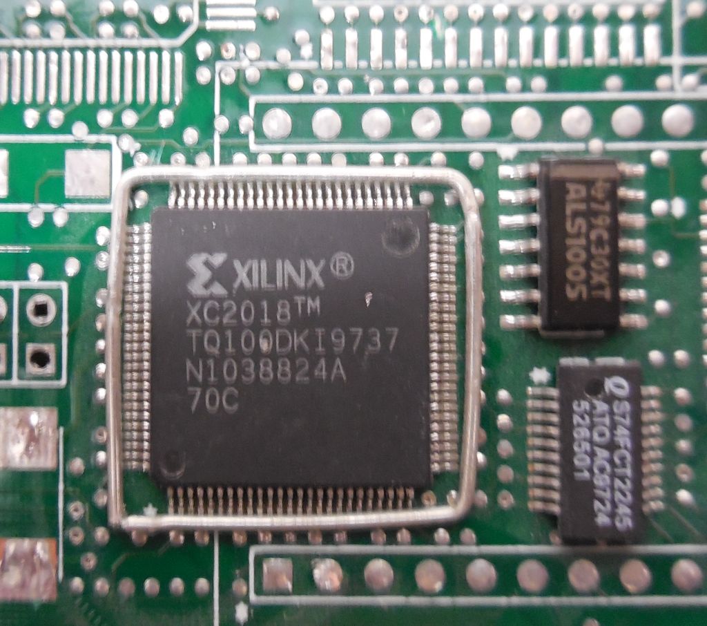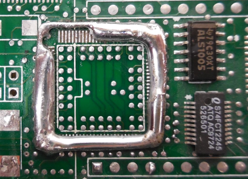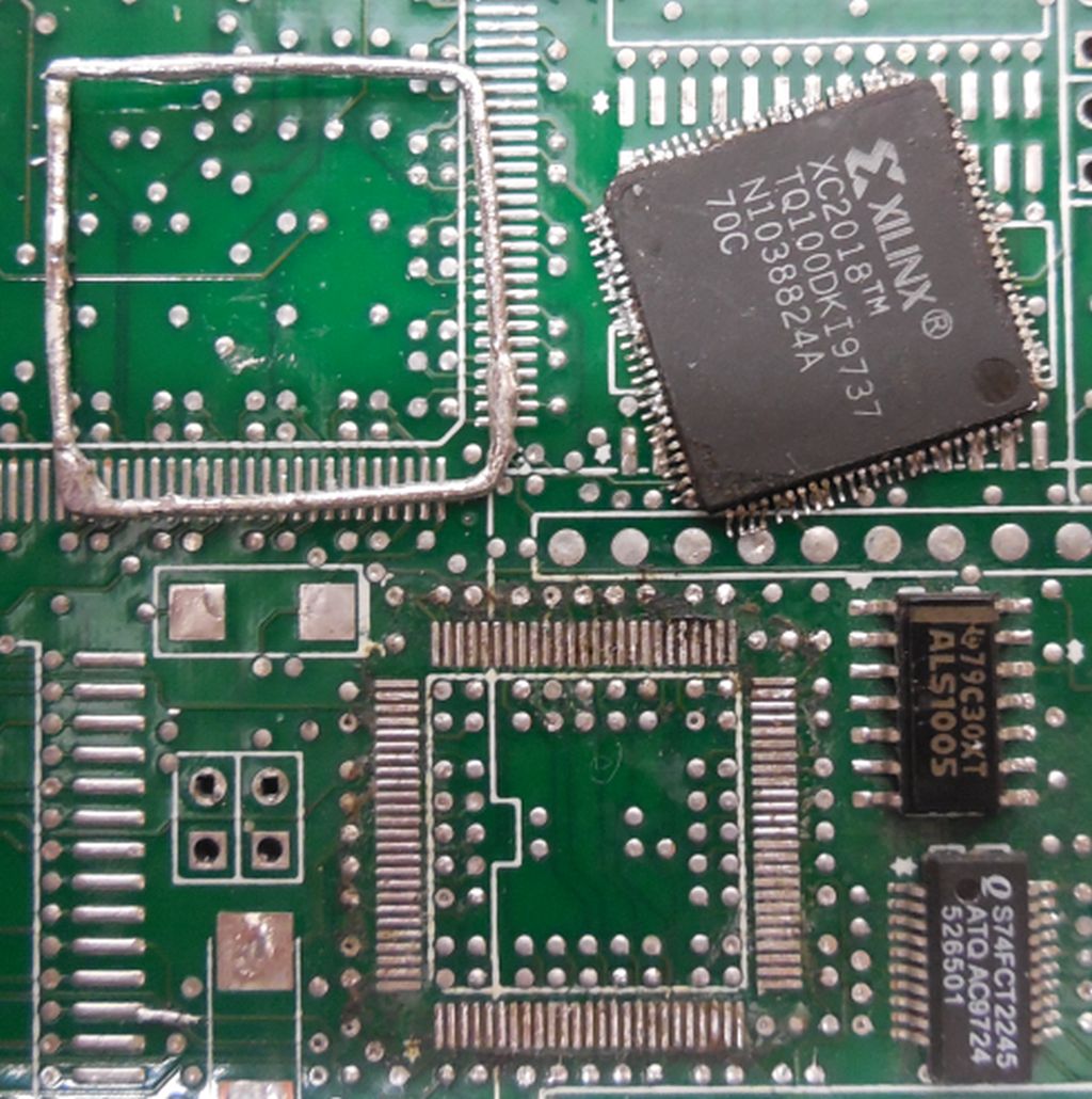 @Walter Das hat mir jetzt keine Ruhe gelassen und ich habe auch mal probiert einen Xilinx auszulöten. Meine Vorgehensweise sieht man in den folgenden Bildern. Die Platine ist unbeschädigt geblieben, aber ob der Xilinx das überlebt hat wage ich zu bezweifeln. Damit mir das Lötzinn nicht wegfliesst habe ich mir eine Büroklammer zurechtgebogen. Ausserdem verteilt sich die Wärme besser. Naja, das Löt-Ergebnis ist nicht gerade schön, aber selten.