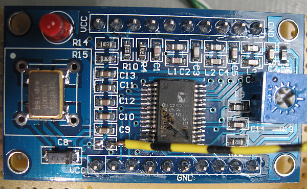 Zurück zur AM-Modulation: Ingos Vorschlag habe ich mit Erfolg ausprobiert, zumal ich auf die 100 bestellten 2N7000 zwei Monate warten muss. Alles auf meiner Seite dokumentiert. Leider liegt am Pin7 meines Moduls ein anderes Signal an. Deshalb musste ich direkt einen Draht an den Pin 12 des DDS-ICs löten. War kein Problem, da man vorher noch den Widerstand R6 auslöten muss und dann hat man ein recht großes Lötpad für das Anlöten des Drahtes.