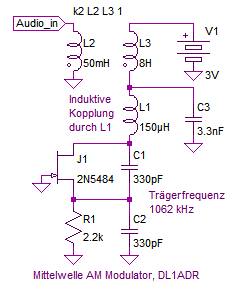 Der Widerstand R1 bestimmt den Arbeitspunkt der Schaltung mit 0,5mA Drainstrom. Der Schwingkreis besteht aus L1, C1, C2. C3 ist auch Teil des Schwingkreises. Der NF Übertrager besteht aus Wicklung L2 und L3. Eine Gate-Basis Schaltung wird üblicherweise für hohe Frequenzen (Kurzwelle, VHF, UKW) benutzt, funktioniert aber auch auf Mittelwelle. Es genügen sehr wenige Bauteile für einen weiteren schlechten Modulator. Aber wer braucht sauberen Modulationsgrad von 100% wenn nur ein Radioempfänger geprüft werden soll. Für meine Ohren hört sich dieser Modulator so gut an wie mein Modulator mit Gilbert Cell IC SA612.