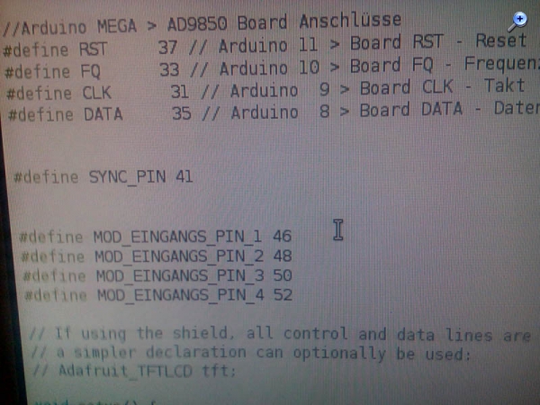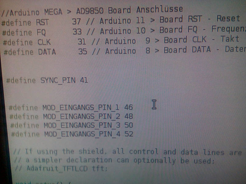 es wurde weitergebastelt. Um die verschiedenen Modulationskanaele (4 Stueck an der Zahl) auf einen physischen Modulationsanschluss am DDS-Modul herunterzubrechen, habe ich einen Analogschalter 4066 verwendet. Die Ausgaenge der 4 Schalter wurden zusammengefasst, die einzelnen Schaltimpulse kommen von noch freien Anschluessen des MEGA2560. Die logische Abbildung erfolgt dann einfach im Programm.