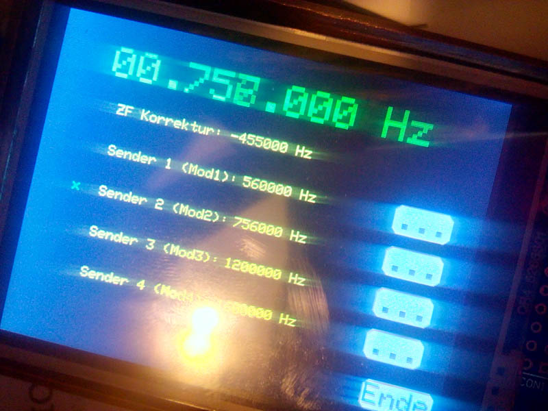 Durch die Moeglichkeit jetzt verschiedene Modulationsquellen per Software zu- und weg-zuschalten, erschliesst sich die Moeglichkeit mit nur einem DDS-Modul mehrere Sender im gesamten Frequenzbereich des DDS zu simulieren. Man muss lediglich die Frequenzzaehleranwendung dahingehend erweitern, dass im Fangbereich einer bestimmten, frei waehlbaren Soll-Festfrequenz das DDS-Modul und der Modulationskanal durch die Software umgestellt wird. Die Ist-Frequenz kommt ja vom Oszillatorkreis des Radios und wird dem MEGA2560 ueber einen Vorverstaerker zugefuehrt und rechnerisch vom Betrag der Zwischenfrequenz befreit. Die Einstellungen wie ZF, Frequenz von 4 simulierten Radiostationen usw kann man bequem ueber das Touchscreen erledigen.