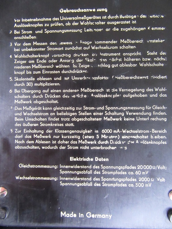 Der Universalmesser (Vielfachmesser) IV von EAW (Einschalten, ausschalten, wegwerfen) wurde Mitte der fünfziger Jahre in Berlin hergestellt. Der Verkaufspreis lag bei 385 Mark, die Daten gehen aus der Beschreibung hervor. Das Herstellerlogo "Made in Germany" wurde erst Anfang der sechziger Jahre durch "Made in GDR" abgelöst. Das Gerät gehört zur Genauigkeitsklasse 1,5 und ist mit einer Spiegelskala ausgestattet. Bei Überlastung sprang der Druckdrehschalter heraus und unterbrach den Stromkreis. Die Einteilung der Messbereiche auf einer dreißiger Skala ist einfach und logisch. Man muss mit Zwei multiplizieren oder durch Zwei dividieren, das war es dann schon. Soweit eine kurze Beschreibung des Multizets.