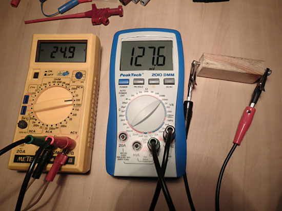 Dann braucht man eine kleine Hilfsspannung. Es reicht auch ein 9V-Block oder Steckernetzteil. Der Rest erklärt sich von selbst. 9,99MOhm * 24,9V / 0,1276V = 1879MOhm. Wenn Ri gut bekannt ist, wird diese Methode sogar genauer sein als der eingebaute GOhm-Messbereich des PT2010. Mein Holz-R wurde vom PT garnicht mal sooo schlecht geschätzt. ;)