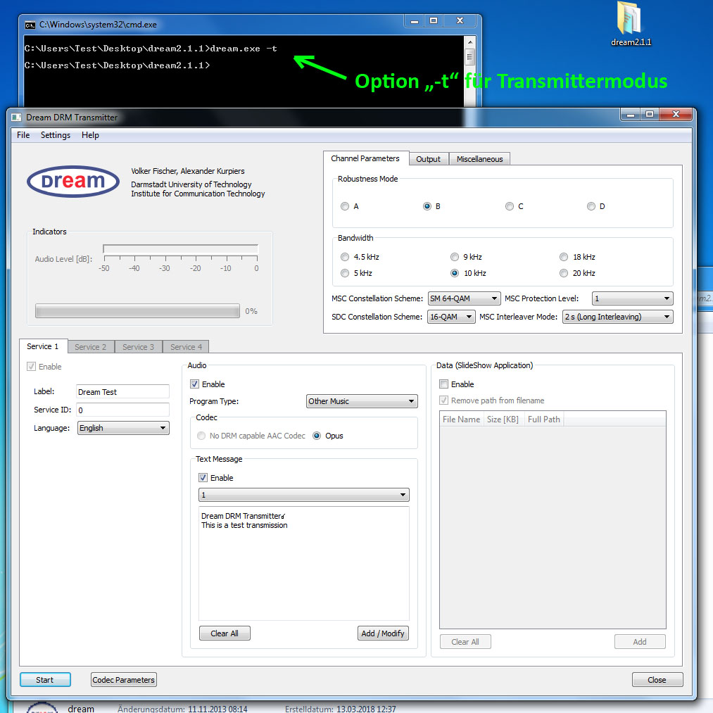 Weniger bekannt ist, das Dream auch in einem Sendemodus gestartet werden kann. Dazu fügt man beim Programmaufruf einfach den Parameter "-t" für Transmit hinzu. Dream sieht dann plötzlich ganz anders aus, nämlich so: