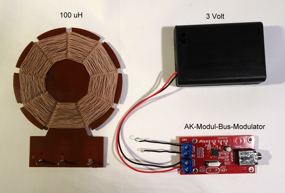Ich habe Versuche mit einem solchen Kleinstleitungs-Modulator gemacht, der an keine Antenne angeschlossen wird, sondern sein HF-Signal nur über die Schwingkreisspule (200 uH) induktiv abgibt.