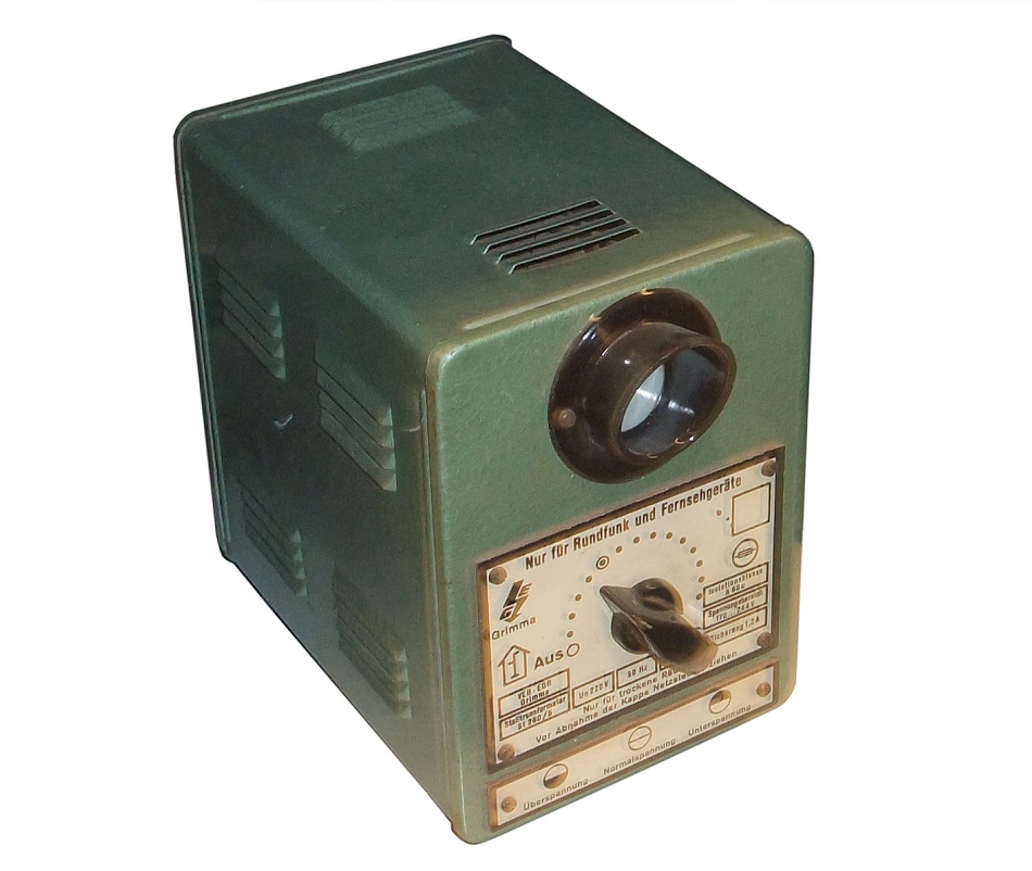 das gleiche Funktionsprinzip hatte ein späterer Nachfoger mit besserem Design. Für den Glühlampenersatz waren "Paare" erforderlich. Ohne den "Stromregler" war das Fernsehen im "Osten" aufgrund relativ starker Netz - Schwankungen in Richtung Unterspannung tageszeitabhängig. Eine teurere Variante war ein vollautomatscher Regler. Ende der 60 Jahre gab es Geräte als Stelltrafo mit Spannungsanzeige.