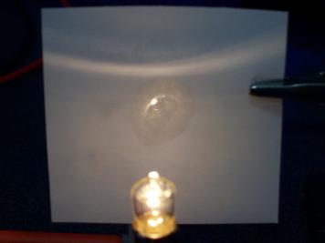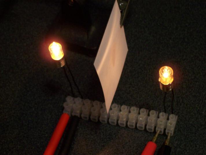 Man schaut dann von der Seite auf das Blatt Papier und stellt die Stromversorgung so ein, dass beide Lampen gleiche Helligkeit zeigen (wobei der Fettfleck verschwindet).