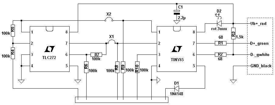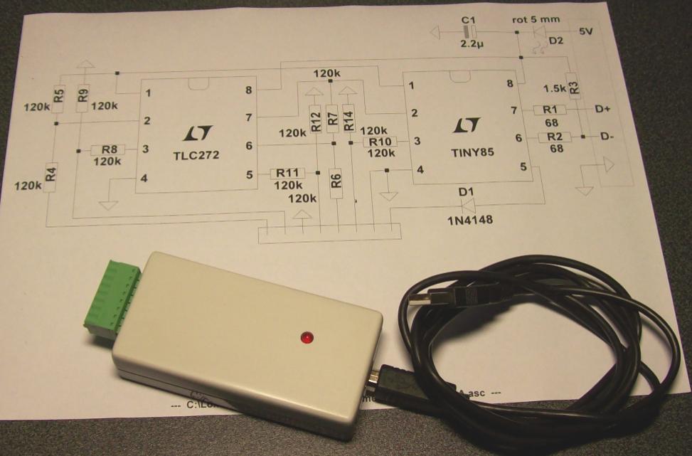 Idee: Man bräuchte einen in ähnlicher Weise gestalteten "Analoganalysator" ("AA"), der die Messung mehrere analoger Eingänge ermöglicht und per USB vom PC versorgt und gesteuert wird. Die Auswertung geschieht dann am PC. Gesagt, getan: