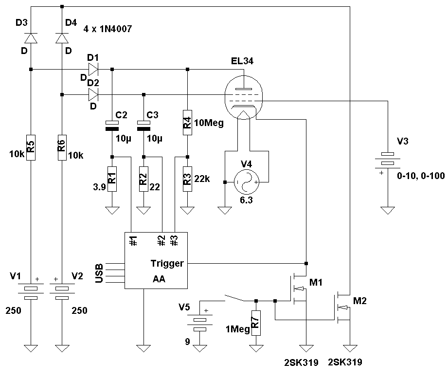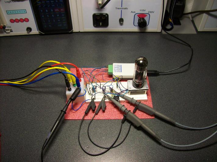 Dieser "AA" wird in eine speziell auf den Prüfling zugeschnittene provisorische Messschaltung eingefügt. Die Messschaltung verfügt weiterhin über ein einstellbares Röhrennetzteil und eine Taste, mit der man eine Impulsmessung durchführt und an den Computer überträgt.