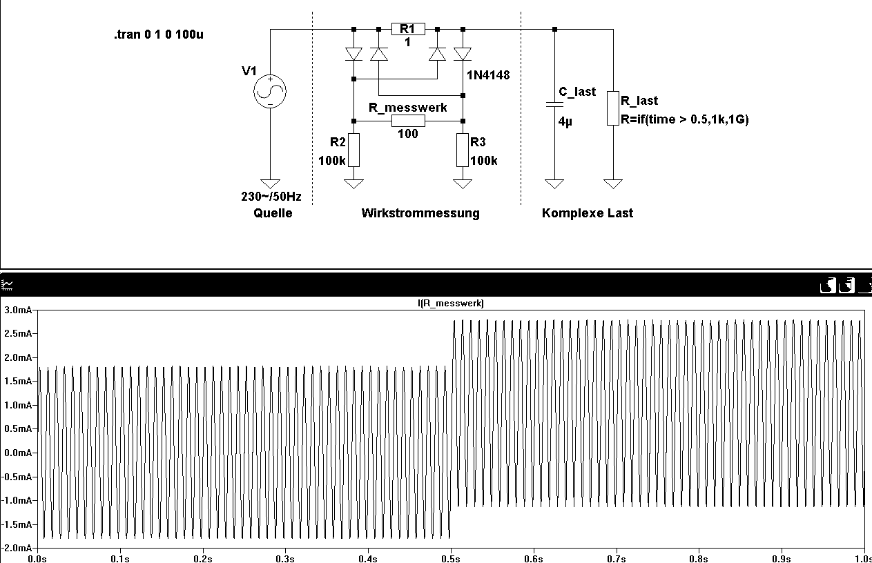 Ab 500ms wird der 1k-Lastwiderstand parallel zum Lastkondensator geschaltet. Man sieht unschwer, dass nun ein mittlerer Messwerkstrom fließt. Das Messwerk zeigt ausschließlich den Wirkstrom durch "R_last" an und ignoriert den Blindstrom durch "C_last".