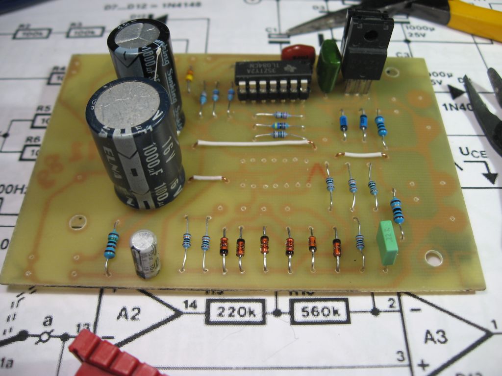 Dank der Platine ging das flott und der Aufbau funktionierte auf Anhieb. Ich hatte auch jedes Bauteil vor dem Einbau geprüft. Leider fehlt mir CD4024, weshalb ich das Treppensignal nicht erzeugen konnte. Aber der Sägezahngenerator funktioniert einwandfrei und liefert je nach Wunsch eine Spannung 0 bis 8 Volt oder von von 0 bis -8 Volt. Erhöht man den R13 von ursprünglich 680k auf 1MegOhm sind sogar +12 Volt und -12 Volt möglich. Mehr geht nicht. Die Spannung des Rechtecksignal für den CLK-Eingang des CD4024 bleibt konstant bei +/- 6 Volt. Es ist auch möglich, dass das Sägezahnsignal von maximal +12 bis -12 Volt verläuft, um Zweipole wie Dioden in Durchlass- und Sperrrichtung zu untersuchen. Dazu ist der invertierende Eingang des Operationsverstärkers A2 gleichzeitig mit den beiden Dioden D6 und D5 zu verbinden, was durch einen zusätzlichen Schalter leicht zu erzielen ist. Getestet habe ich alles mit einem externen stabilisierten Netzteil bei +/- 14 Volt.