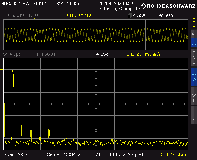 Es gibt nur wenige Oberwellen mit niedrigem Pegel, daneben ist noch das Steuersignal und der Lokaloszillator etwas über 600MHz zu sehen.