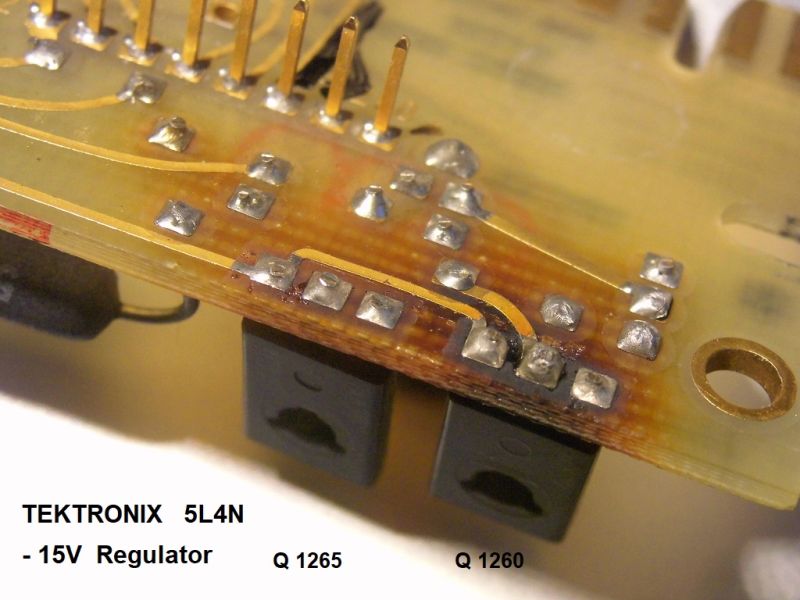 Die Sichtkontrolle zeigte eine auffallende Braunverfärbung im Bereich des -15V Regulators. Die beiden Längsregler Q1260 und Q1265 werden verdammt heiß und haben trotzdem keine Kühlkörper mitbekommen. Zu wenig Platz? Bevor nun tiefergehende Messungen vorgenommen wurden, musste an dieser Stelle erstmal aufgeräumt werden. Es möge deutlich sein, zwischen den Anschlüssen von Q1260 besteht eine mehr oder weniger stark leitende Verkohlung! Somit ist die Stabilität der geregelten Ausgangsspannung nicht mehr gewährleistet....