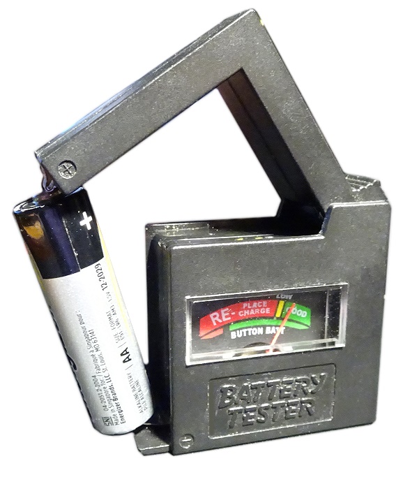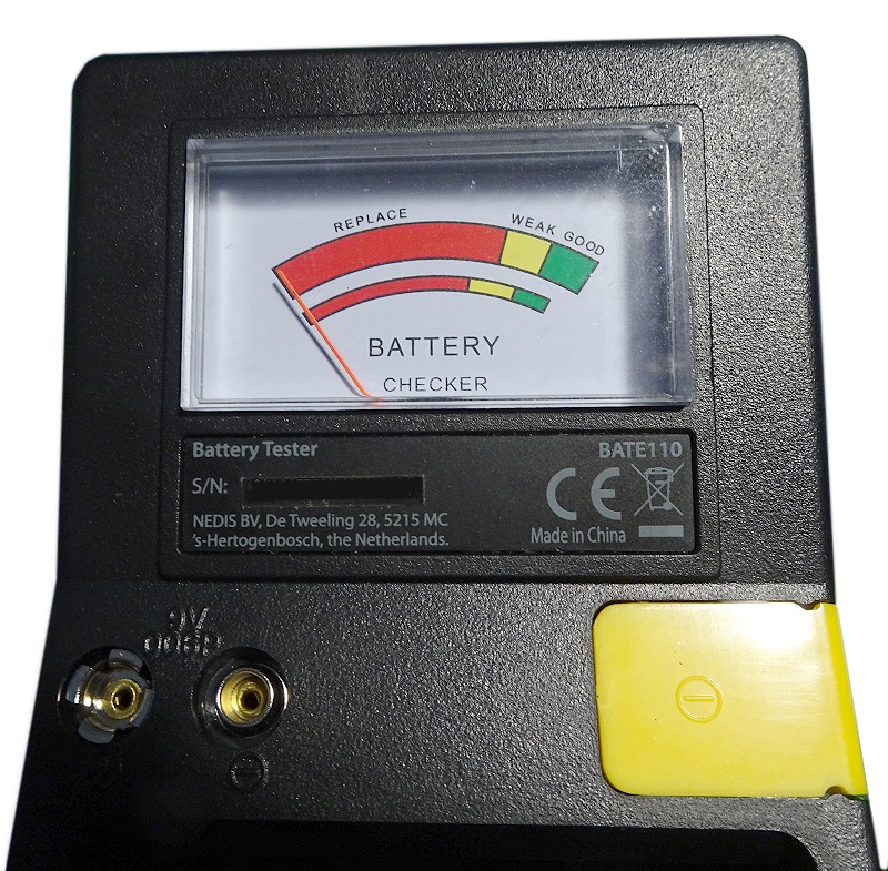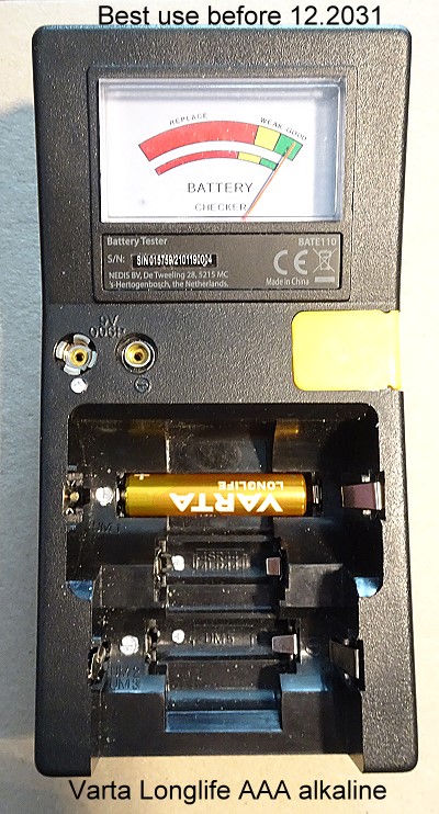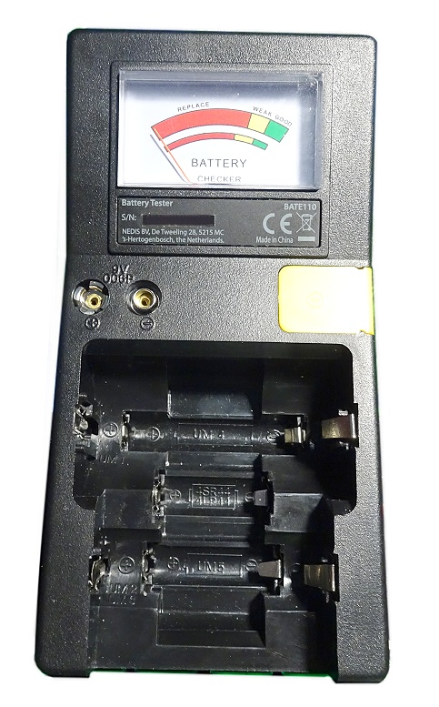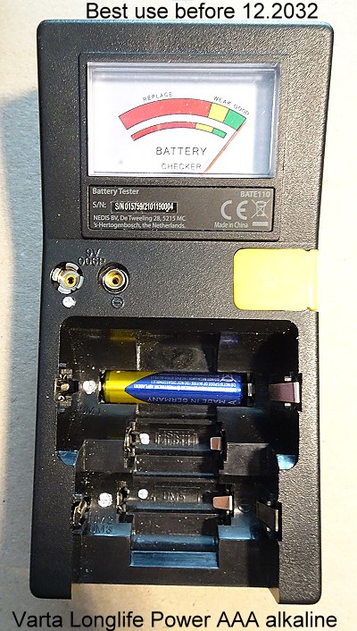 ein weiterer Batterie-Tester, der wohl auch von Hama, Dlyfull und anderen angeboten wurde. Er hat eine AAA-Versorgungsbatterie. Es können die klassischen Batterieformen, 9 Volt und auch verschiedene Knopfzellen geprüft werden. Die Anzeige ist als LCD-Balken-Reihe und Bereich-Bezeichnungen ausgebildet: Good, weak, poor.