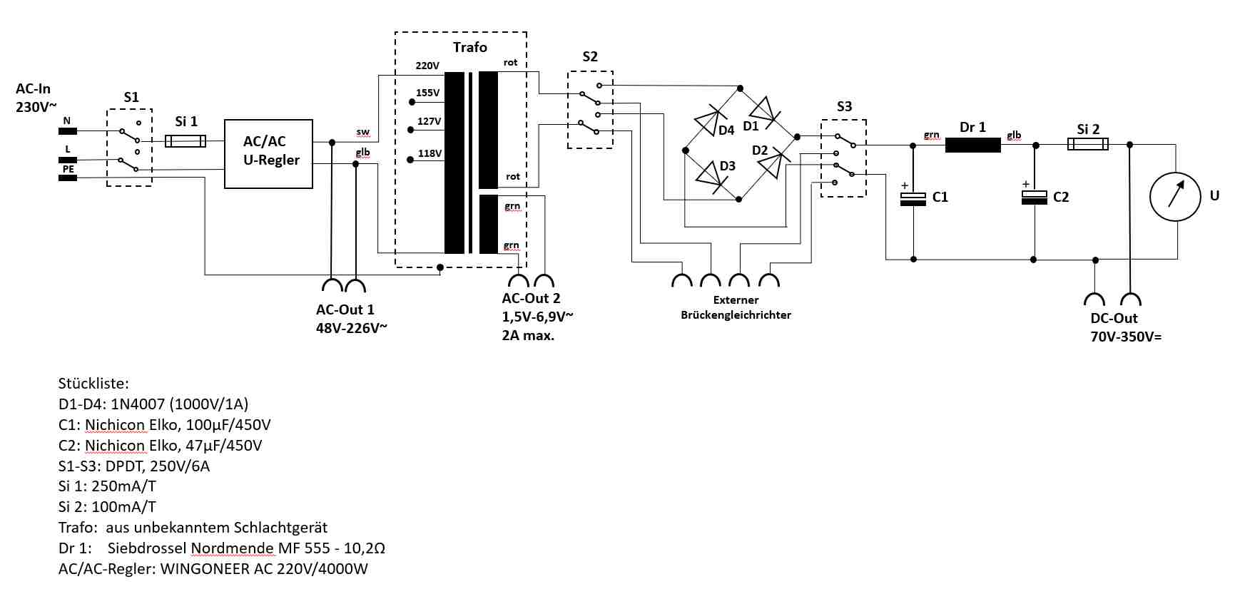 Um die Spannung einstellbar zu machen habe ich bei Amazon einen AC/AC-Wandler besorgt, kostet ca. 10,00€, mit 2 DPDT-Schaltern wird der der Si-Brückengleichrichter ausgekoppelt und an externe Buchsen geschaltet, so kann dann ein externer Gleichrichter geprüft werden. Die einstellbaren Spannungen sind im Schaltplan aufgeführt, aus der 6,3V-Wicklung des Trafos kann eine niedrige Wechselspannung mit erhöhtem Strombedarf abgenommen werden.