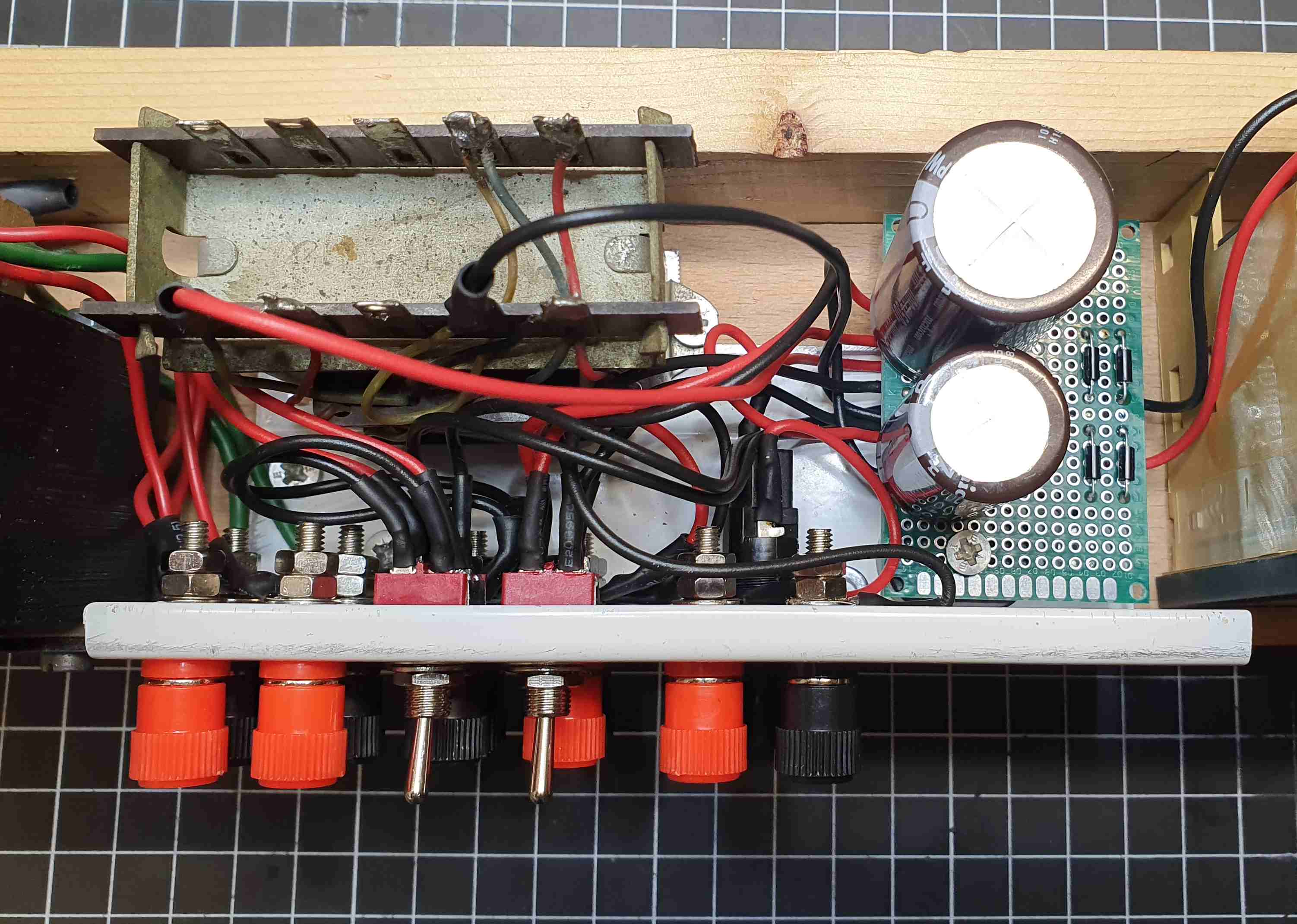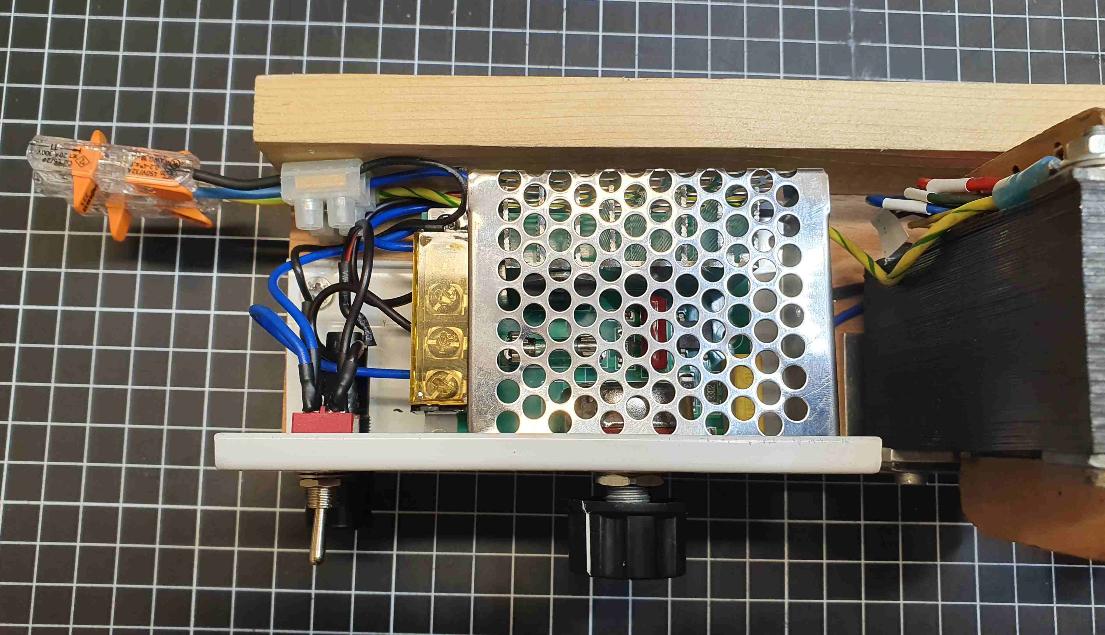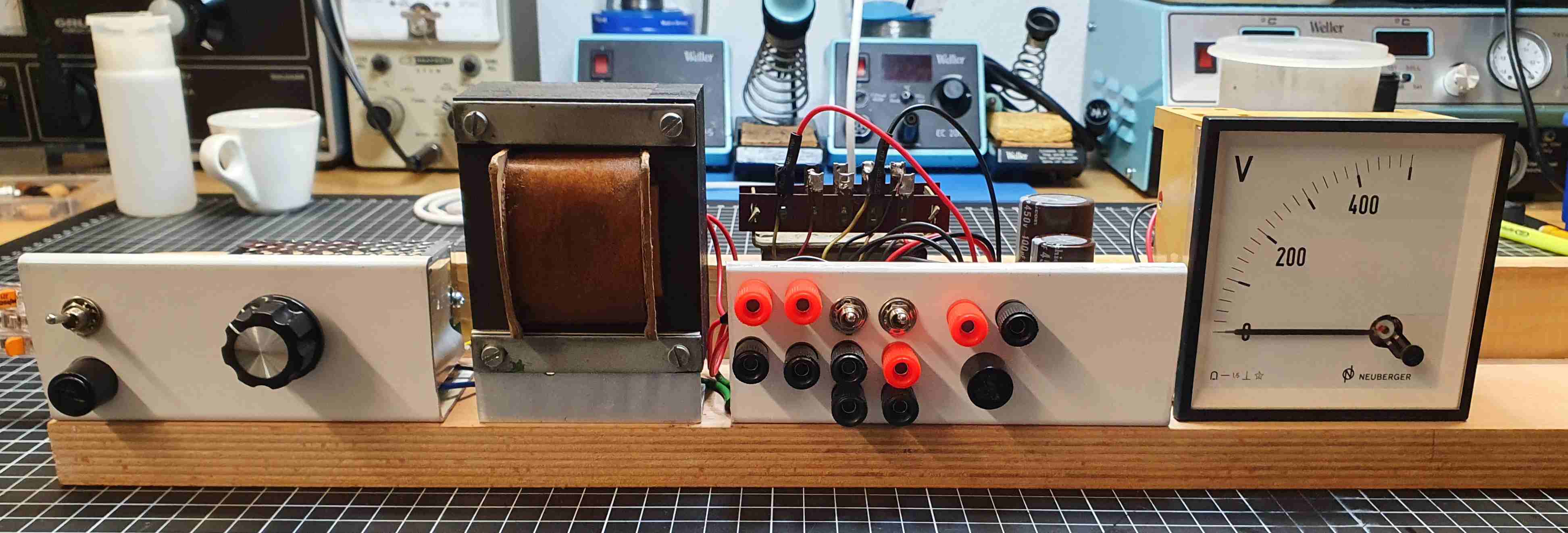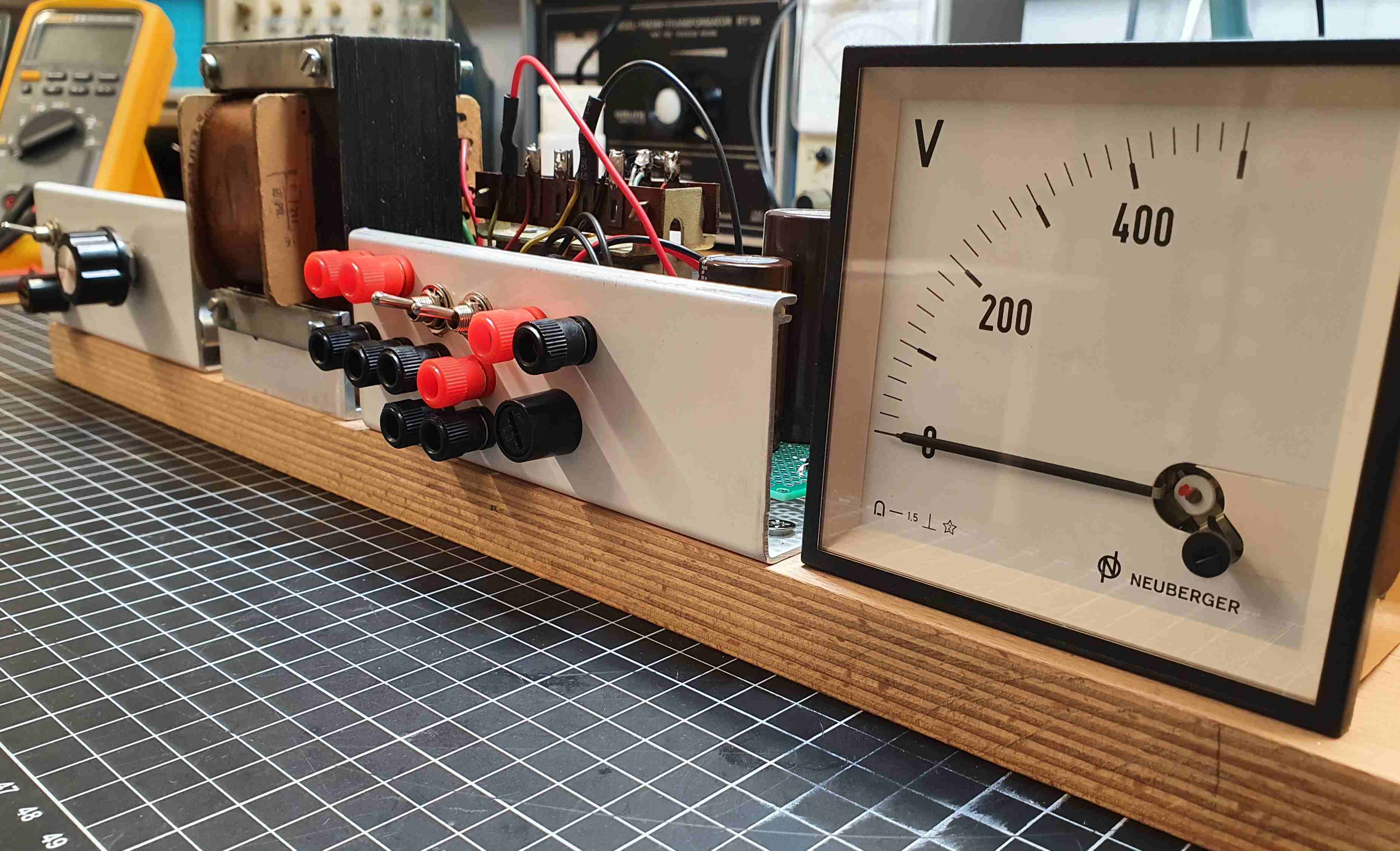Nach einer Küchenrenovierung sind diverse Holzleisten übrig geblieben, auf eine von diesen ist die Schaltung montiert. Das weiße Aluprofil stammt von einem abmontierten Duschvorhangschiene. Ein Neuberger Voltmeter zeigt die Ausgangsspannung.