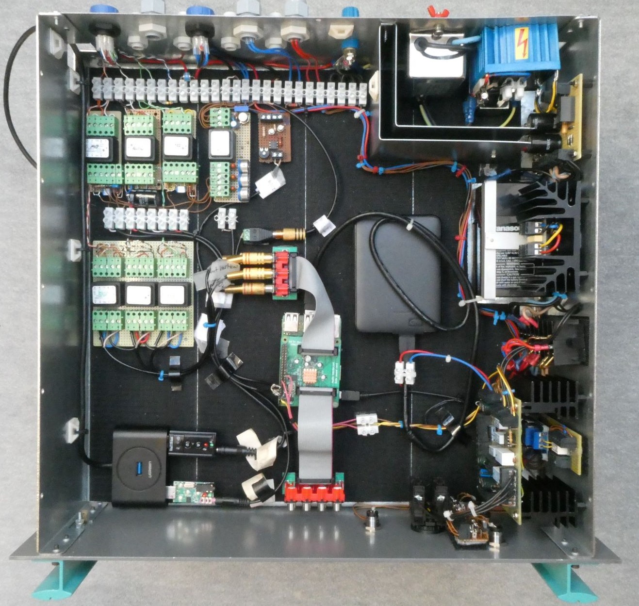 Als Beispiel für diese Art der Montage zeigt das Bild die Kopfbaugruppe des VLF-Grabbers unserer Clubstation DL0AO (vlf.u01.de), die ich in einem 19-Zoll-Einschub aufgebaut habe. Sie stellt die Schnittstelle zwischen den drei abgesetzten Empfangsantennen und den Auswerterechnern dar. Auf der rechten Seitenwand befindet sich die weitgehend konventionell realisierte, fest eingebaute Infrastruktur zur Stromversorgung und Ablaufsteuerung. Alle übrigen Komponenten sind mit Flauschband-Streifen an der durchgehend mit Hakenband beklebten metallischen Grundplatte des Einschubs befestigt, einige auch an individuell beklebten Front- und Seitenblechen. Der Aufbau wurde während der letzten 3 Jahre mehrfach problemlos modifiziert und erweitert. Er umfasst aktuell diverse Klemmenleisten, Leiterplattenmodule mit Audio-Transformatoren und elektronischen Schaltungen, eine Festplatte, einen USB-Hub mit zwei USB-Soundkarten sowie einen RasPi-Mikrorechner mit Octo-Soundkarte und Anschlussmodulen – alles mit Klettband montiert! Auch Kabelbäume lassen sich mit schmalen Klettstreifen definieren und fixieren. Sehr stark strukturierte Flächen wie z.B. die Unterseiten handverdrahteter Lochrasterplatten kann man nötigenfalls mit etwas Heißkleber (je nach Typ ebenfalls durchaus HF-geeignet) ausfüttern und damit die Haftungsfläche der Klettstreifen vergleichmäßigen.