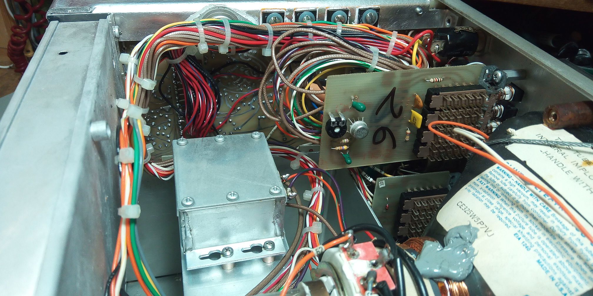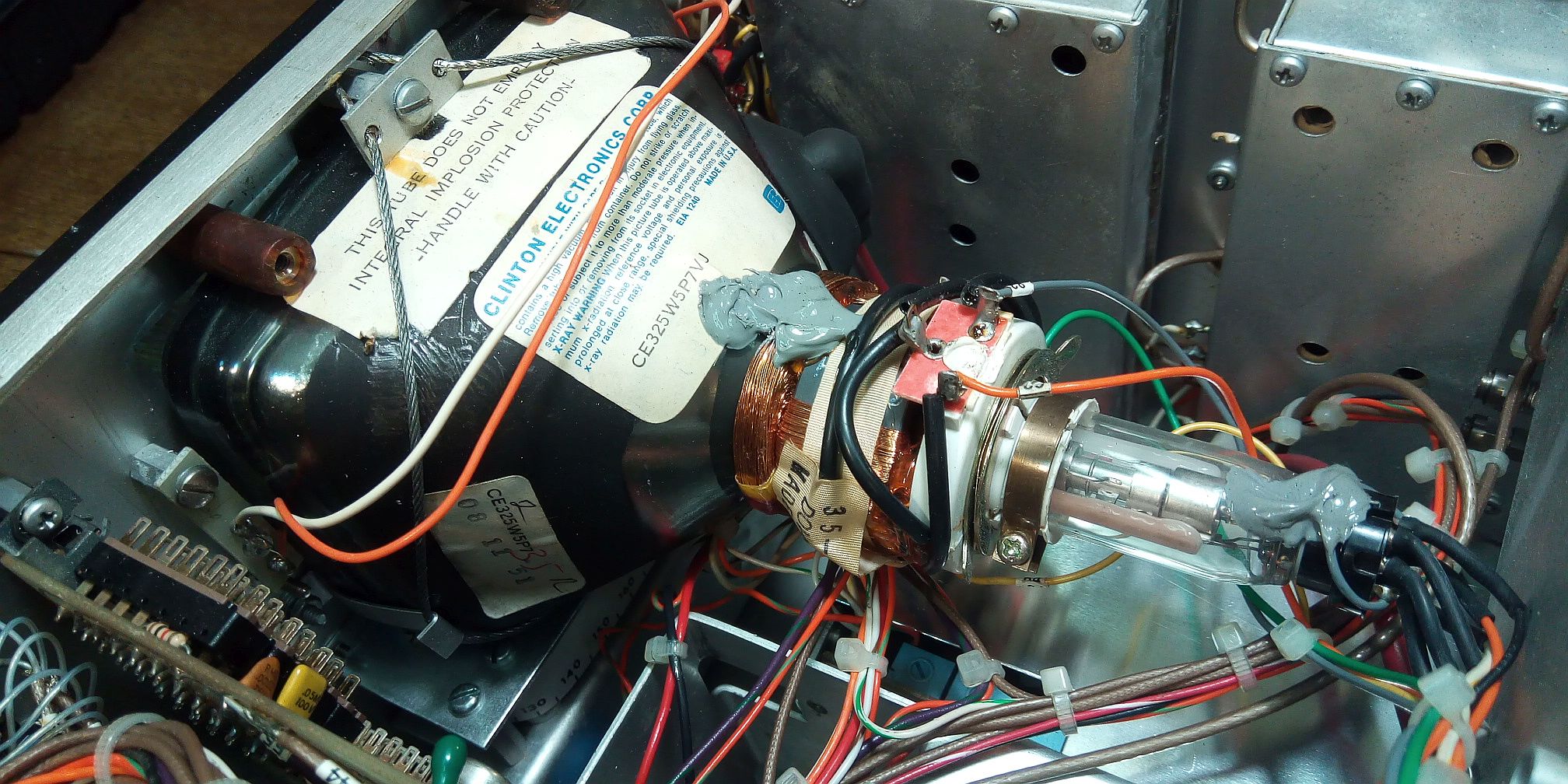 schöne Bilder. Da gibt es jeden Menge Potis für einen Neuabgleich Die Bildröhre hat eine magnetische Ablenkung, das ist ziemlich ungewöhnlich für so ein Gerät, dazu noch der Zweifarben-Leuchtstoff. Das dürfte eine ziemlich exotische Röhre gewesen sein. Normalerweise kamen derartige Bildröhren in tragbaren Fernsehern zum Einsatz, aber dann mit weiss leuchtendem Bild und eher kurzer Nachleuchtdauer.