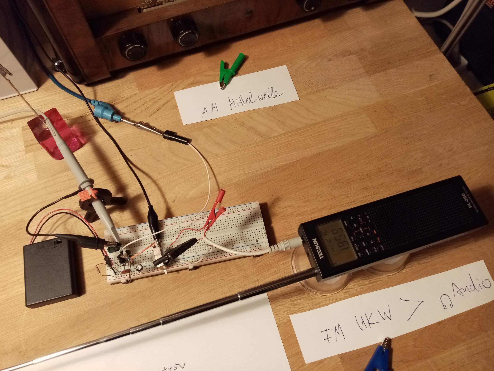 Zu den Transistorradios ohne Antenneneingang: Der ungeschirmte Aufbau hat eine "Reichweite" von ca 20 bis 30 cm. Wenn man den Modulator z.B. in eine flache Plastikbox einbaut und das Radio darauf oder daneben stellt, wird das bestens funktionieren. Habe das ausprobiert und war sehr erstaunt, wie gut beispielsweise die Grundig Transistorbox 59 sogar bei klassischer Musik klingen kann.