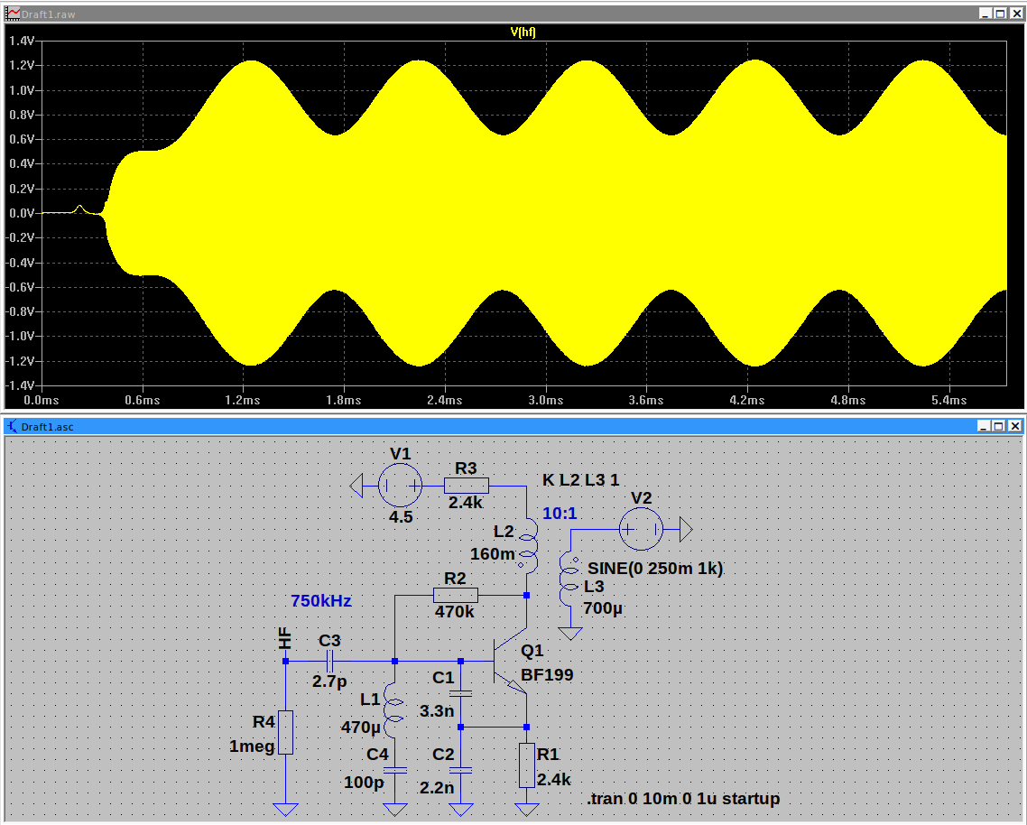 Die Besonderheit meiner Schaltung ist zum einen der Clapp-Oszillator, der bei Änderung der Versorgungsspannung zwar die HF Amplitude proportional ändert, aber die Frequenz stabil hält. Zum anderen der Ausgangs-NF-Trafo, der hier den niederohmigen Kopfhörerausgang für die AM herauf transformiert.