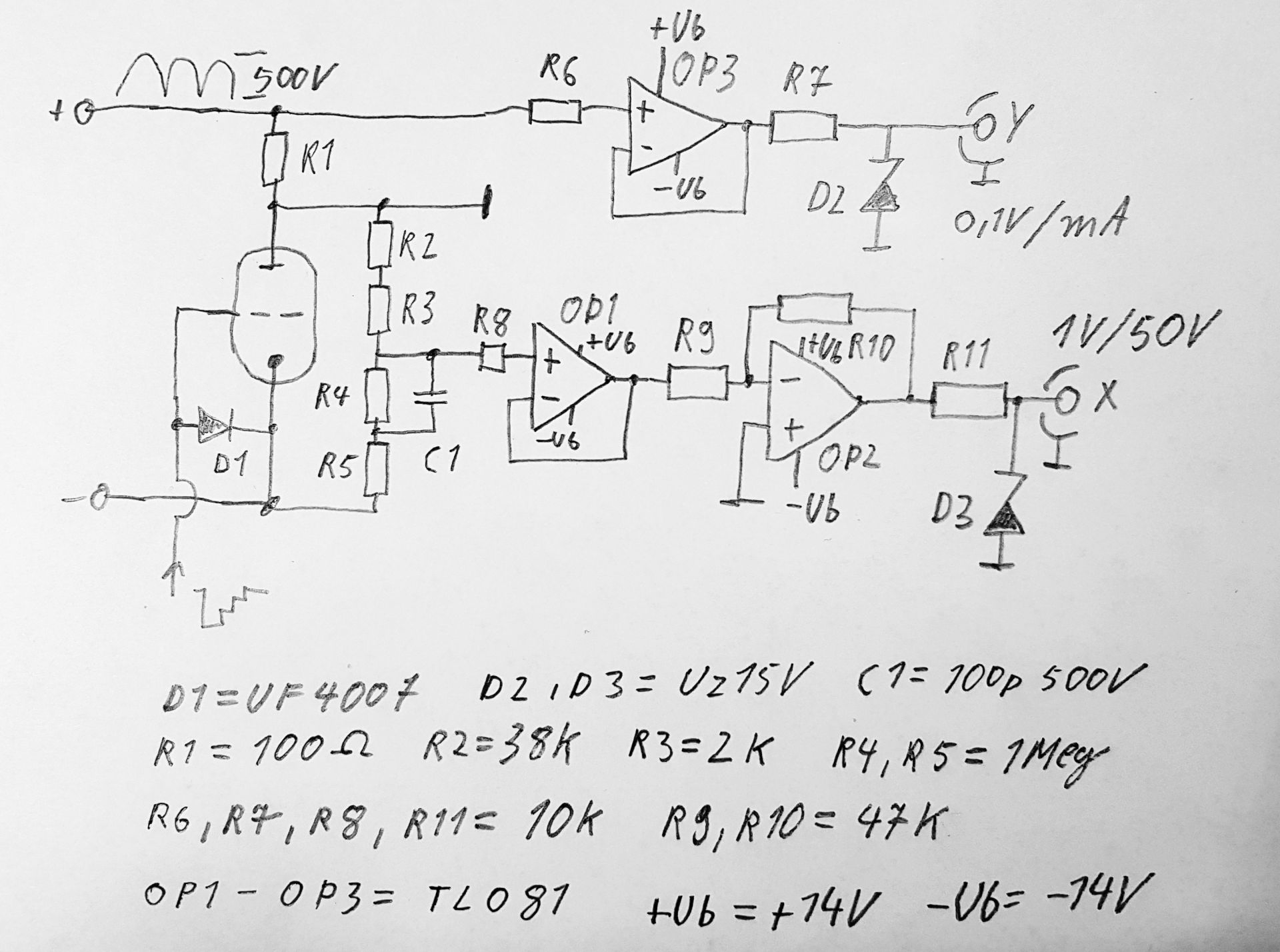 Der erste Testaufbau verzichtet auf die Schirmgitterspannung. Für den Anfang lassen sich dann nur Ausgangskennlinien von Trioden darstellen. Bin mal gespannt. Passende Trafos habe ich jedenfalls gefunden. Um entspannt arbeiten können, will ich auf jeden Fall die Eingänge des Oszilloskops mit vorgeschalteten Operationsverstärkern und Z-Dioden vor Überspannung schützen und den das Signal für den x-Eingang invertieren. Das sieht dann besser aus und schützt das Oszilloskop.