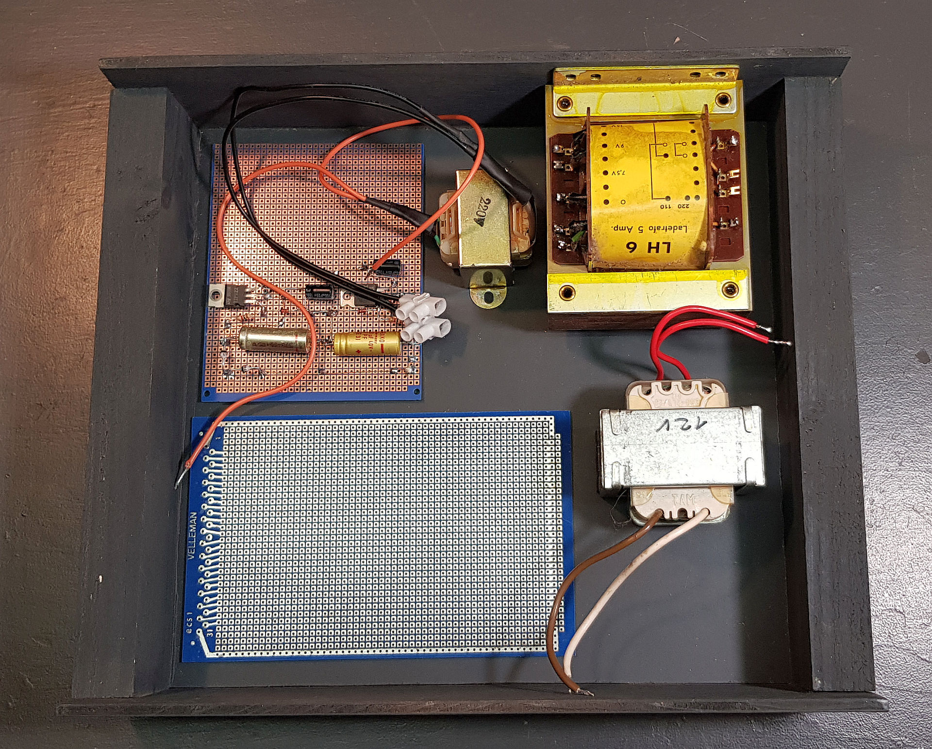 Es geht schleppend weiter. Ein passendes Gehäuse ist gefunden. Die Frontplatte wird durch Glasfaserplatinenmaterial ersetzt. Geeignete Trafos habe ich auch noch gefunden. Ein Experimentiertrafo liefert 7,5 und 9 Volt. Ich nehme die 9 oder 7,5 Volt und transformiere sie mit einem Netztrafo 220 V zu 12 Volt hoch. Dann wird die Anodenspannung nicht zu hoch. Es lässt sich alles experimentierfreudig unterbringen: