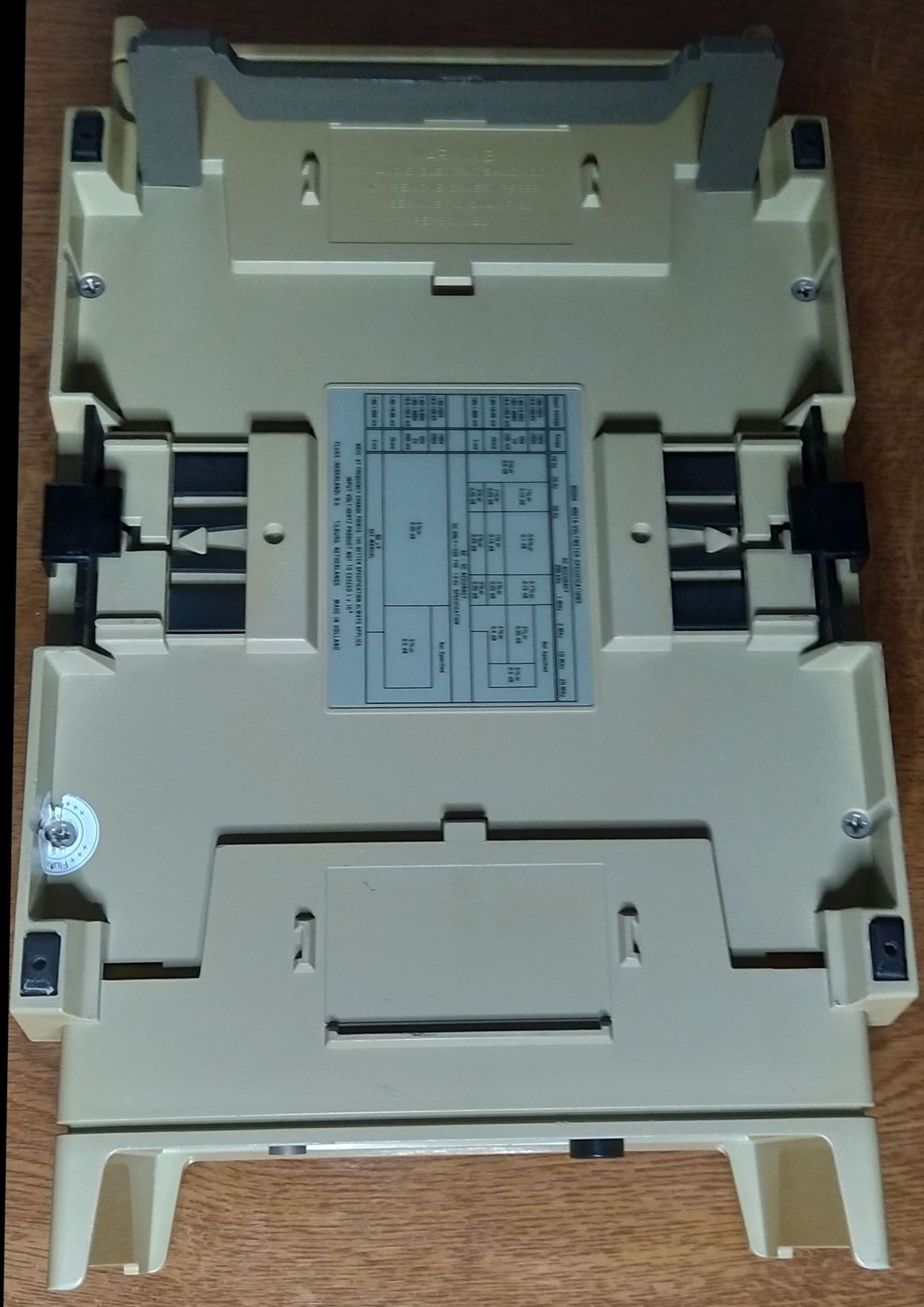 Diese Geräte gehören zu einer stapelbaren Serie von Messgeräten zum Rumschleppen, Es gab separaten Akkukasten, optionale Schnittstellenkarte für den kleinen Drucker und so einiges mehr. Dieses Exemplar hat davon nichts installiert, deswegen hinten der Deckel. Sie sehen oft ziemlich verqualmt, vergilbt aus, das Reinigen ist eine Tortur.