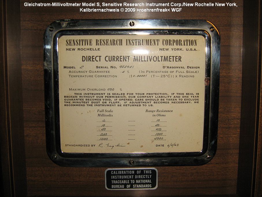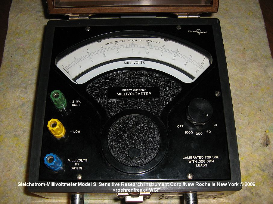 nach erfolgreicher Reparatur - der Zeiger war verbogen - ziert ein Gleichstrom-Millivoltmeter Model S des amerikanischen Herstellers "Sensitive Research Instrument Corp., New Rochelle/New York USA" meine Messgerätesammlung. Bis auf die Tatsache, daß jene Firma in die "Singer Co.", welche heute der "SVP Group" angehört, aufging, konnte ich keine Erkenntnisse wie Baujahr, technische Details oder Schaltplan über das Gerät erlangen. Es wurde offensichtlich von der US-Army benutzt und ist dank Diamant-Lager ein hochempfindliches Präzisions-Messgerät dessen "Hochspannungs-"Messbereich 1Volt bewältigt! Nun wäre die Frage ans Forum ob jemand dieses Gerät vielleicht kennt und erschöpfendere Auskünfte geben könnte. Der Dank ist gewiss!