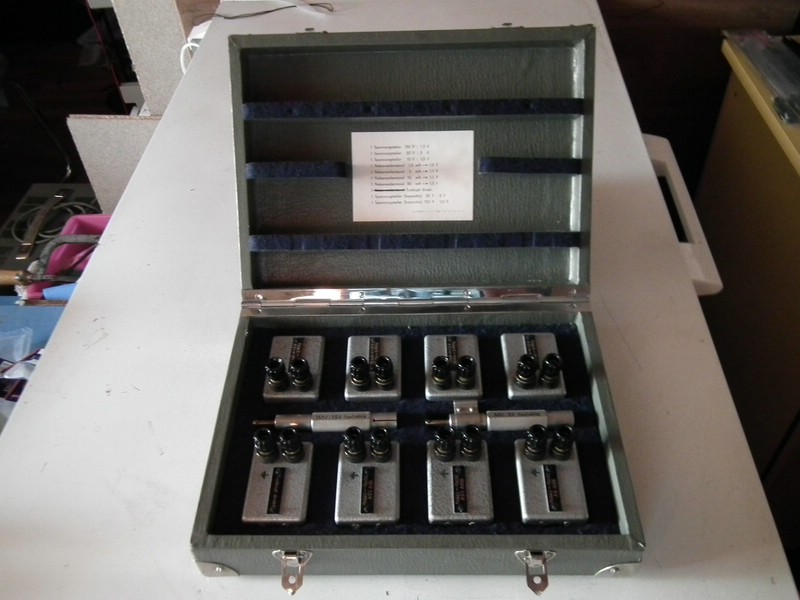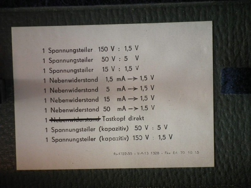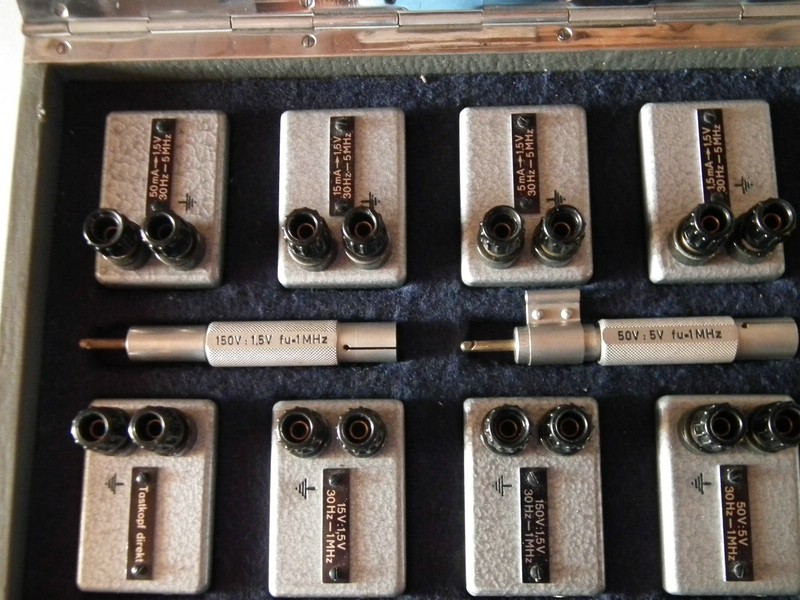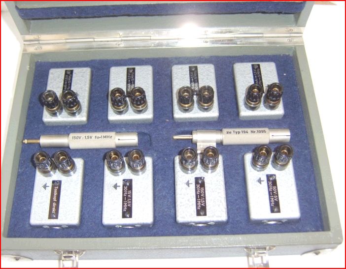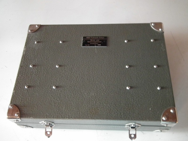 Hier der Versuch einer Aufklärung. Der Koffer dürfte zum Strom- und Spannungsmesser Typ 194, Baujahr 1954 vom Funkwerk Erfurt gehören. Dieses Gerät war zur Messung an Niederfrequenz- und Trägerfrequenzanlagen gedacht. Es arbeitet passiv, eine Stromversorgung ist nicht nötig. Spannung 0,15 Volt für Vollausschlag. Frequenz 30Hz bis 200 Mhz. Die Erweiterung der Meßbereiche erfolgte mit den im Koffer befindlichen Meßaufsätze und den Tastköpfen. Das Grundgerät findest Du im RMorg unter 194, Hersteller Funkwe-erf.