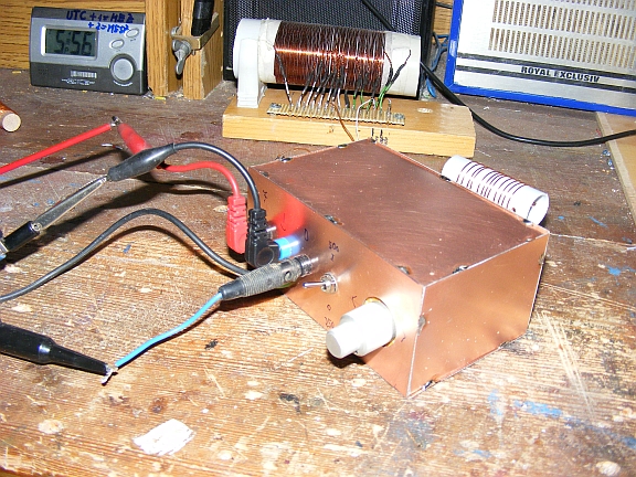 Nachdem ein Freund aus Lehrzeitstagen, mir einen Frequenzmesser überlassen hat, kann ich nunmehr endlich meine empfangenen KW und MW - Sender definieren. Dazu habe ich einen kleinen Dipmeter nachgebaut. Den Plan fand ich auf der Internetseite von Herrn Kainka. Zuerst dachte ich na ja, probiers mal, wenns schiefgeht ist nicht viel verloren. Es ging nichts schief, sondern funktioniert wider Erwarten sehr genau und zuverlassig. An einen Drehko 2x15-245 pF baute ich eine Feineinstellung 10:1. Das Gehäuse besteht ganz aus kupferkaschierten Platinen. Ein Ausgang geht zum Oszi, der andere Ausgang zum Frequenzmesser, in der Mitte ist der Masseanschluss. Mit dem kleinen Schalter kann ich 245pF bis auf 500 pF erhöhen. Die Spulen sind selbst gewickelt. Die kleine Spule ist für Kurzwelle. Die Grosse im Hintergrund ist für Mittelwelle mit unterschiedlichen Anzapfungen. Mit den Spulen bin ich noch am experimentieren, bisher kann ich den Kurzwellenbereich von ca.2-20mHz und den gesamten Mittelwellenbereich bestreichen. Hei, macht das Spass, endlich kann ich die Sender ausfindig machen. Auf Listen aus dem Internet finde ich die empfangenen Sender, teils mit näheren Angaben.