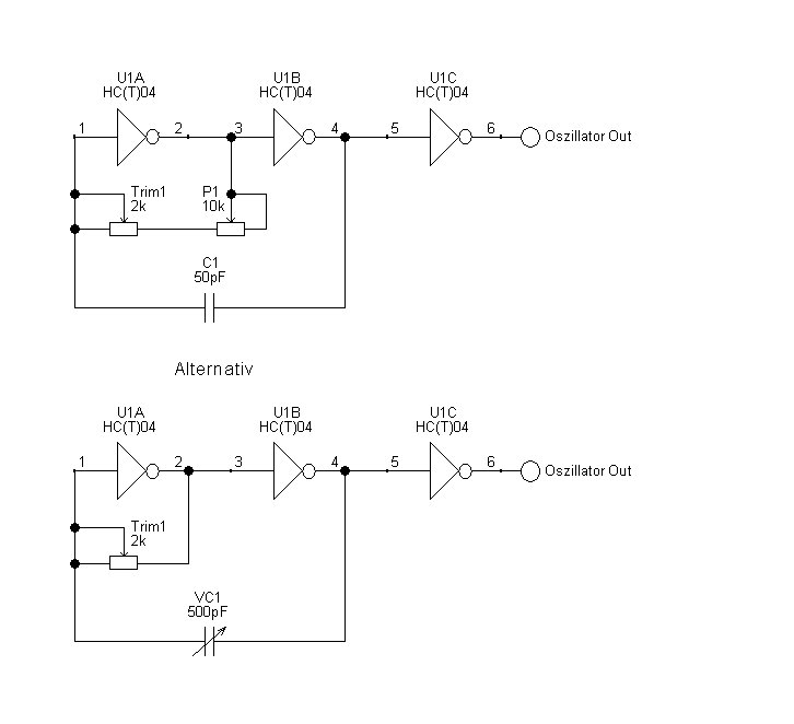 Du hast Recht, die Dipper sind wirklich gut. Ich habe mir mal vor langer Zeit so ein Gerät gekauft. Es leistet mir heute noch gute Dienste. Leider gab es keine Möglichkeit für den MW und LW Bereich. Ich habe mir dann auch Spulen selbst gewickelt. Für den Bereich oberhalb 250MHz habe ich mir mal das Grid-Dipmeter aus dem rothammels nachgebaut. Hier komme ich mit einer PC88 auf 900MHz. Mit Transistoren (BFR90) komme ich mit einem Multivibrator auf knapp 1,1GHz und das mit einer Lochplatine. Im Moment mache ich Versuche mit Oszillatoren mit dem SN74HC04. Hier kann man variable Oszillatoren bis ca 100 MHz (je nach Hersteller) aufbauen (siehe Anhang). Über einen 3,3pF Kondensator teste ich dann meinen LC-Schwingkreis meines Audions. Übrigens, mit den HC und HCT-Typen kann man leicht einen VCO aufbauen. Diese CMOS-Bausteine ändern ihre (Durch)Laufzeit mit der Versorgungsspannung. Diese TTLs arbeiten ca. im Bereich von VCC=2..6V.