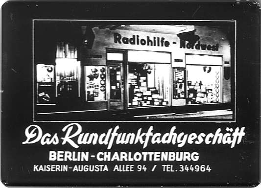 Ist nicht zu fassen. Nu haben wir sogar ein Foto von die Firma. Ich kann aber jetzt nich mehr sagen ob der Name wirklich Radiohilfe Nord West war. Das Radio ist leider weg. Ich lebe seit vielen Jahren bei Nürnberg aber wie unser bekannter kommen wir von Berlin. Ich hab mir nun einen Stadtplan von Berlin genommen und weiß wo das war. Die Straße kenne ich sogar aus meiner Kinderzeit. Dank dir Reinhard für das Spiegelfoto.