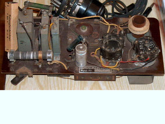 Besagter Kollege hatte auch diesen Einkreiser mit den 3 mal RV12P2000, den er wiederum von dem Verwandten bekommen hatte. Auch in Berlin war ja direkt nach dem Kriege die Neuproduktion von Radios teilweise sanktioniert. Wie die da einige Geräte produziert haben, kann man nur vermuten.