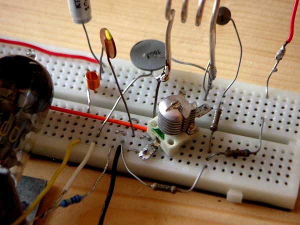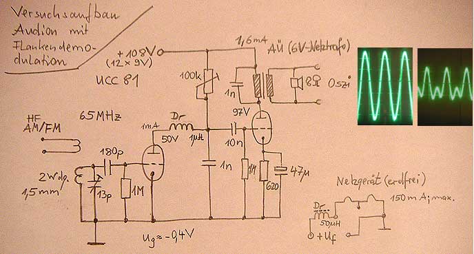 Hier noch mal der Link zum einfachsten UKW- Pendelempfänger. Hier sogar mit Anodenspannung < 50V. Die Laborsteckplatine dient nur zu Einspeisung und NF- Auskopplung.