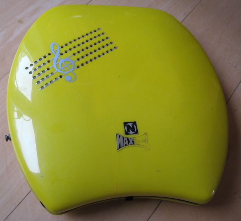 das Deutsche Rundfunk-Museum e.V. erhielt eine Anfrage einen portablen batteriebetriebenen Plattenspieler betreffend. Die Platte wird in einen Schlitz (auf dem Photo unten) eingeschoben. Ein Transistor-Verstärker ist eingebaut. Auf einigen Kondensatoren steht "EKT". Oben steht "N" und ein Wortteile "Maxi.....".