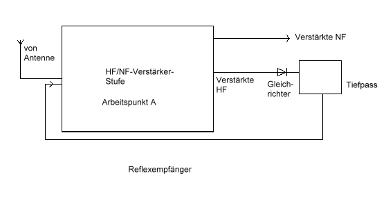 bei Wiki ist zum Reflexempfänger eine ganze Menge zu finden. Dort ist auch ein Einröhrenreflex zu sehen. Patent DE293300 Hier ist der Rückpfad zum Eingang gut zu sehen.