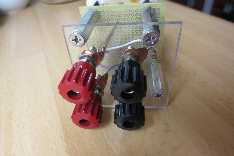 Aus diesem Grund und da sich der Taschenresonator noch in einer Testphase befindet, ist der Aufbau ein bisschen improvisiert. Ein paar Stehbolzen, Lochrasterplatine, Makrolonabdeckung für die Buchsen, konnten schnell montiert werden. Das Ergebnis zeigt die hohe Güte des Kreises. Wenn ich dieses Minniprojekt abgeschlossen habe, will ich einen NF- Röhrenverstärker für meine Radioexperimente bauen. Anschließend geht es an den UKW- Empfang mit Spannungen < 50V.