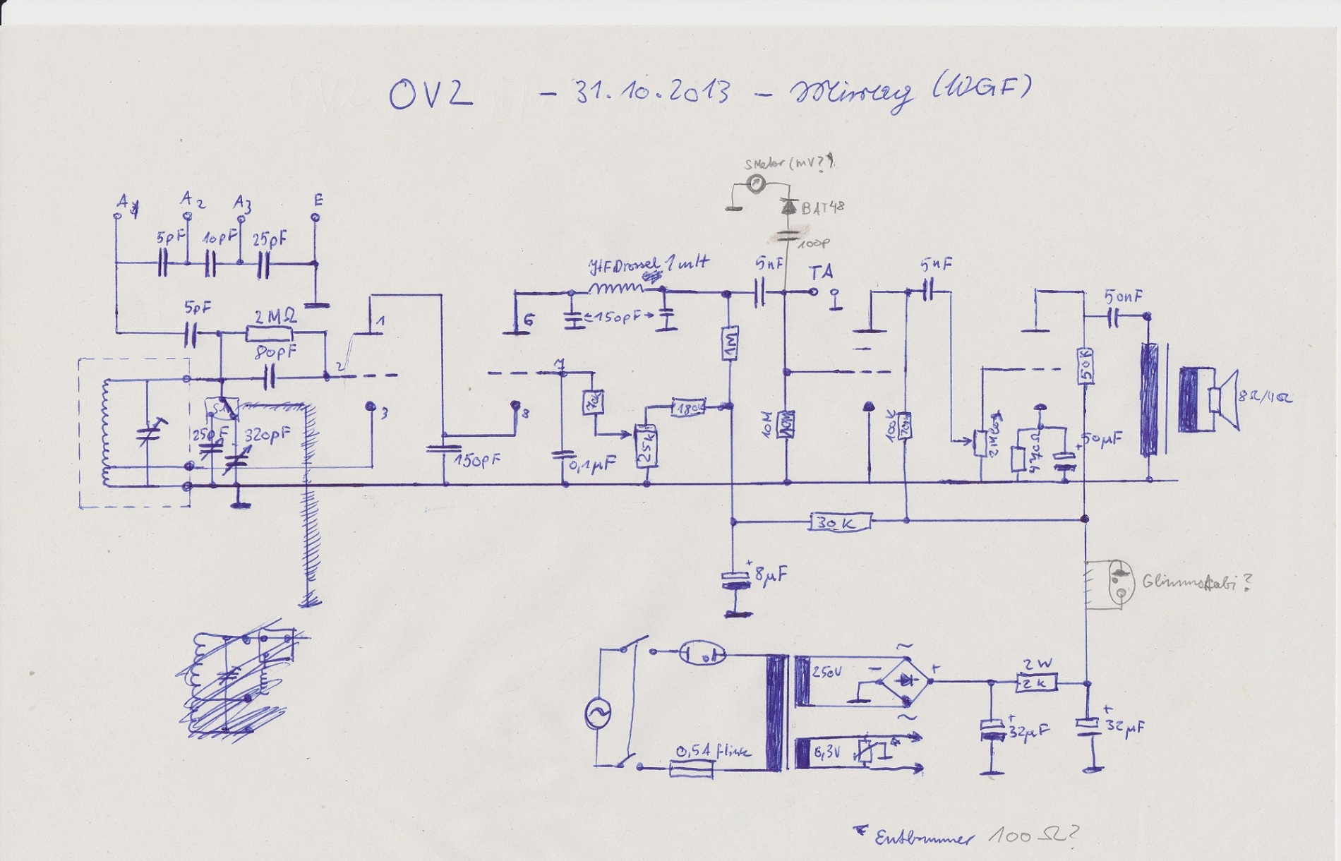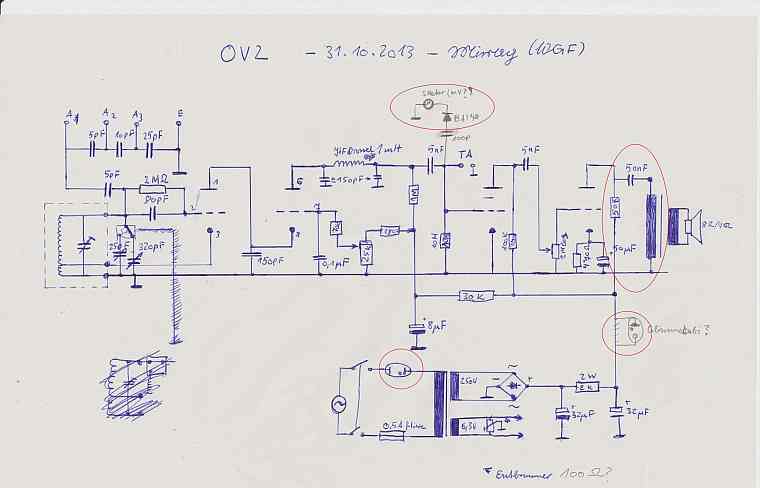 Eine Schaltung habe ich schon gefunden. Sie stammt grundsätzlich von einem Bausatz der von einer Fernschule. Allerdings möchte ich sie etwas verändern und brauche, da ich aber keine wirkliche praktische Bastelahnung hab, bitte ich euch mich zu unterstützen. Ich hoffe, dieses Projektchen hat auch eine Lernwirkung für mich. Änderungen, die ich"geplant" habe: von den Steckspulen umschaltbar auf eine MW Spule (Umschalter 25pF-320pF, Spule hat nichtmehr hingepasst), ein S-Meter, eine Stabiröhre für die Anodenspannung und ein entbrumm-Poti (oder leg ich den ersten Heizanschluss besser auf Masse und verdrossel die andere Leitung?). Bis auf den MW Teil habe ich alle diese Änderungen mit Bleistift eingezeichnet. Ich habe hier noch eine 6SH4 Stahlröhre (Baugleich mit HF-Pentode 6AC7). Könnte man diese in einer aperiodischen Vorstufe verheizen? Von einer Abgestimmten würde ich absehen wollen, da das mit den Steckspulen schwierig ist.
