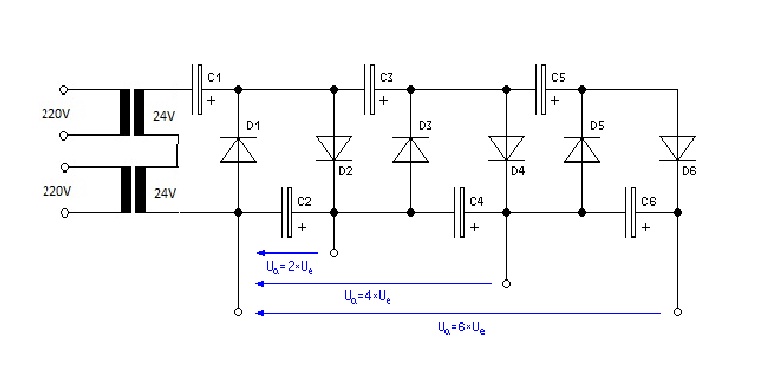 Wenn ich jetzt die Formel Ua = 2 * n * Ue anwende und als Werte n=4 (4-stufige Kaskade) und Ue = 24V annehme, wäre das Ergebnis doch: